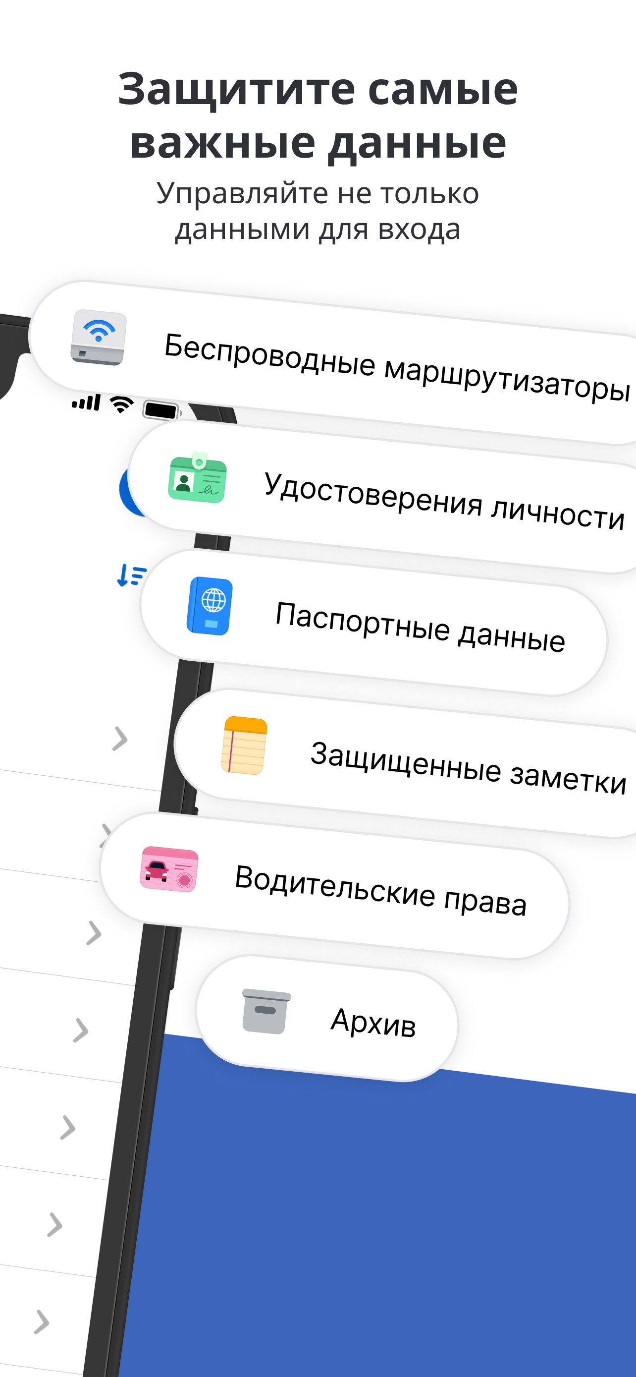 == Защитите и организуйте свою цифровую жизнь == Более быстрый вход в систему — это только начало. В 1Password вы можете не только управлять паролями и ключами доступа, но и хранить всю вашу ценную личную информацию, включая кредитные карты, заметки, банковскую информацию, медицинские записи и многое другое. Ваша личная информация защищена и доступна на любом устройстве.