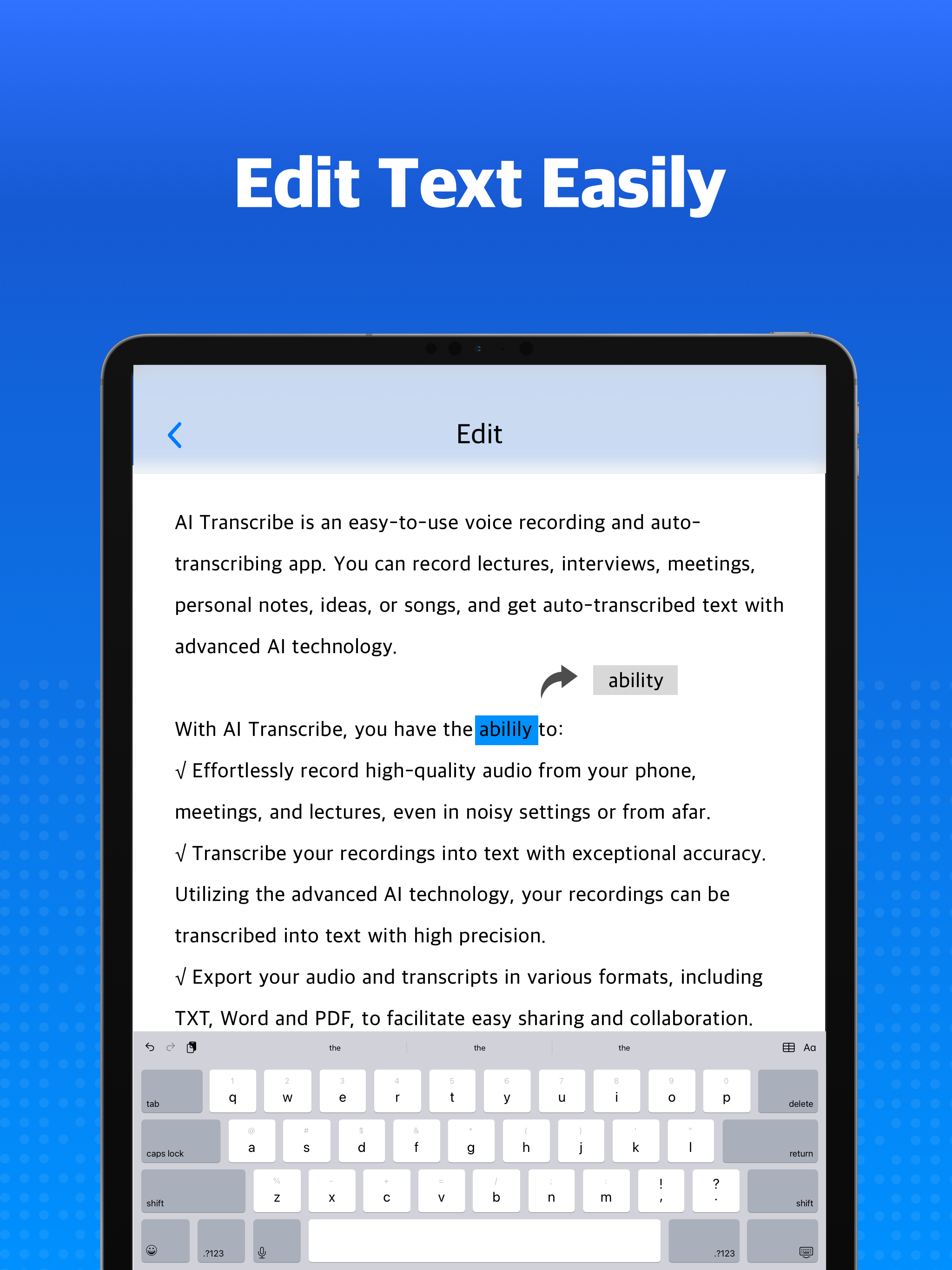 √ Export your audio and transcripts in various formats, including TXT, Word and PDF, to facilitate easy sharing and collaboration.