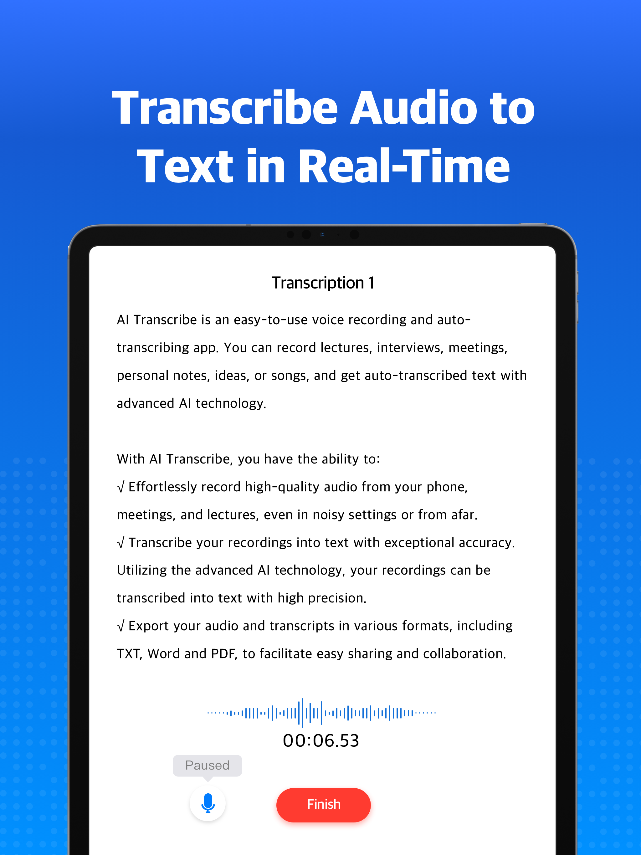 √ Transcribe your recordings into text with exceptional accuracy. Utilizing the advanced AI technology, your recordings can be transcribed into text with high precision.