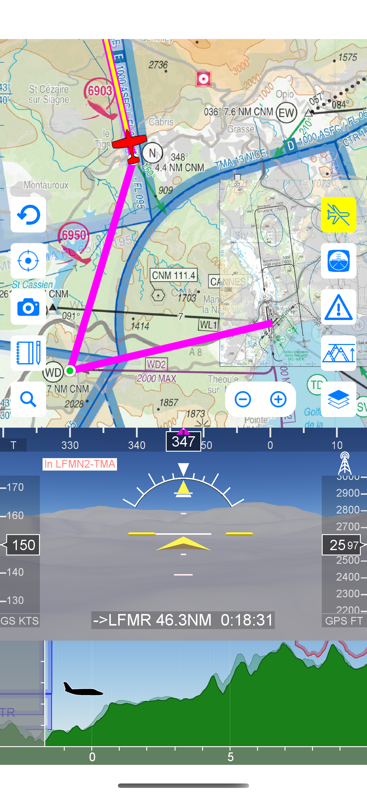 Durante el vuelo, la carta móvil mostrará la posición del avión todo a lo largo de la ruta, pero también los aeropuertos y detalles de datos aeronáuticos, le avisará si su ruta planea cruzar áreas restringidas. Una vista de perfil está disponible para mostrar la elevación del terreno a lo largo de la ruta. Airmate incluye una base de datos aeronáutica mundial, actualizada gratuitamente con los aeropuertos, las balizas de navegación, los waypoints, las vías aéreas y las áreas reglamentadas y restringidas. Las cartas topográficas de numerosos países se pueden descargar gratuitamente.