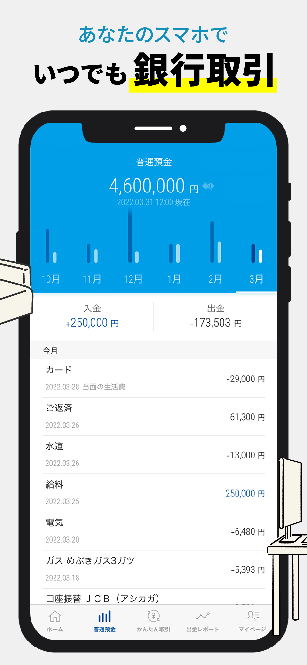 唯一の不満は『この一年で貯金がいくら増えたか(減ったか』みたいな情報が取れない事です。月毎の入出金も必要かもしれませんがそちらの方がよっぽど気になります。預金額の推移を折れ線グラフででも表示してくれれば済む話なのでアップデートお願いします。