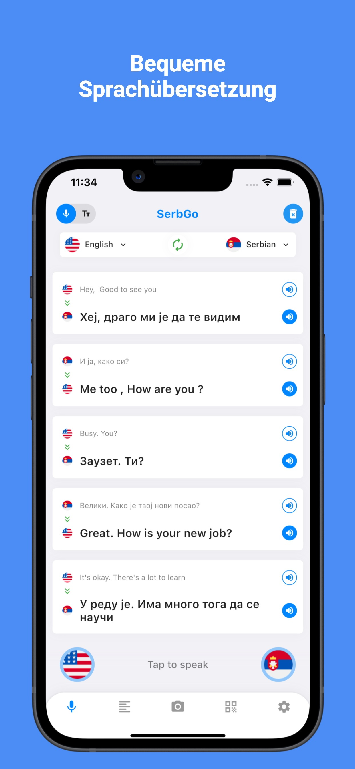 SerbGo ist die führende Serbisch-Übersetzer-App mit vielen herausragenden Funktionen wie präziser Sprach-, Text- und Fotoübersetzung aus dem Serbischen in 45 Sprachen und umgekehrt.