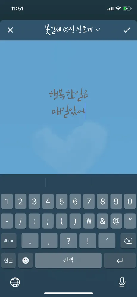 내 손글씨를 합성하기 위한 목적으로 앱을 깔았지만 글씨의 색깔을 마음대로 바꿀 수 없다는게 아쉽다. 검정색말고도 하얀색,분홍색 등등 여러색상으로 내가 쓴 손글씨 색상을 바꿀 수 있으면 좋겠다.