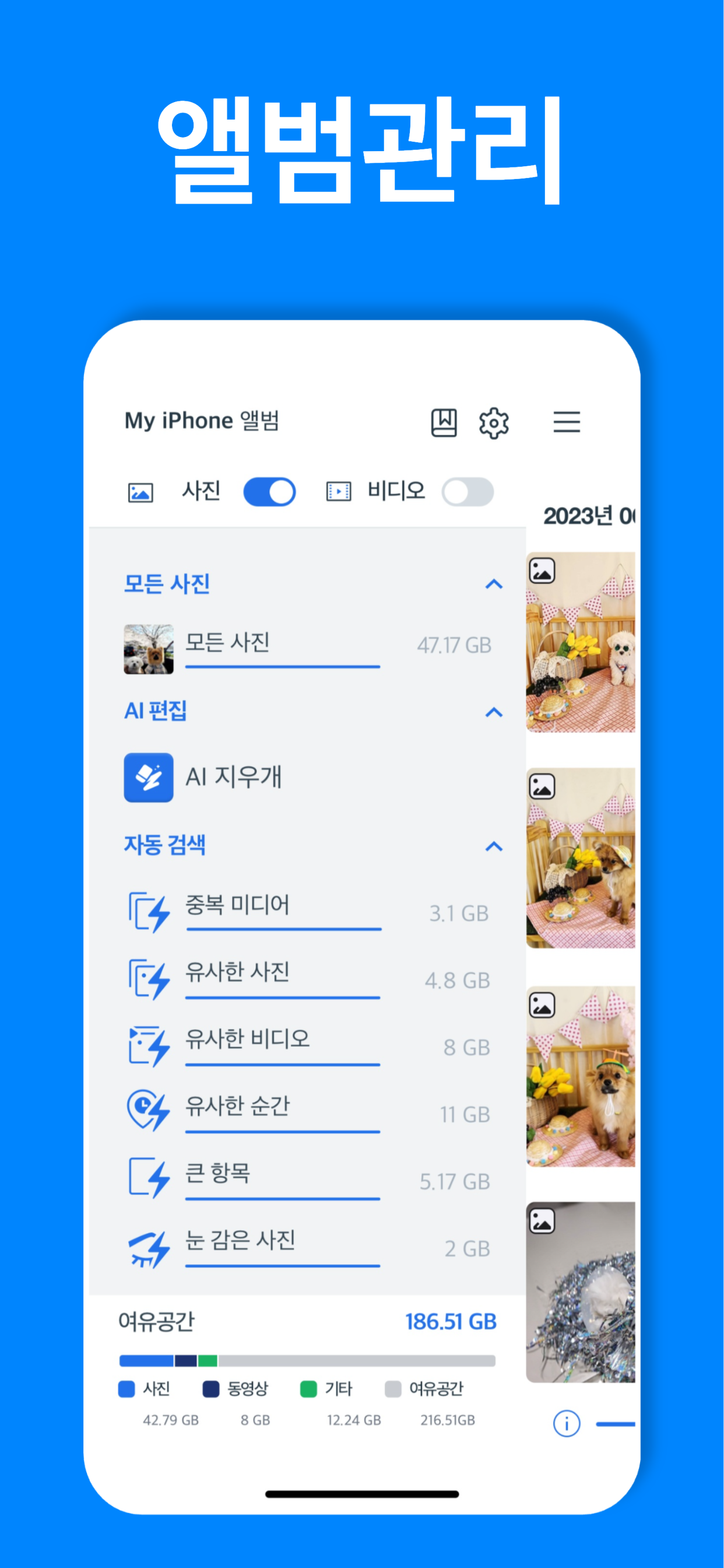 앨범 정리할 때 사진 넣을 앨범 정렬 조정할 수 있게 부탁드려요 ㅠㅠ 너무 불편해요
