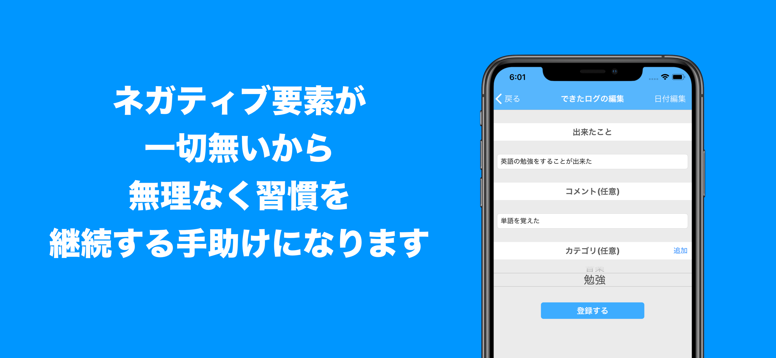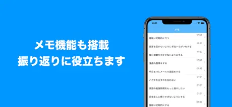 使いやすいです。他にないアプリだと思います。 自分ができたことを見ていると、意外と頑張ってたんだなと自己肯定感があがります。 カテゴリ分けも日付設定も、月ごとに分けてリスト化してくれるのも良いです。 ひとつ言うなら、カテゴリごとにログを確認できる機能がほしいです。