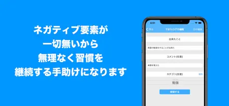 できたことがどんどん溜まっていくので、習慣ではなく一回だけの行動も記録できるので使いやすいです。カテゴリ別に見られるのも嬉しい。今日使い始めたばかりですが、続けたいなと思いました。
