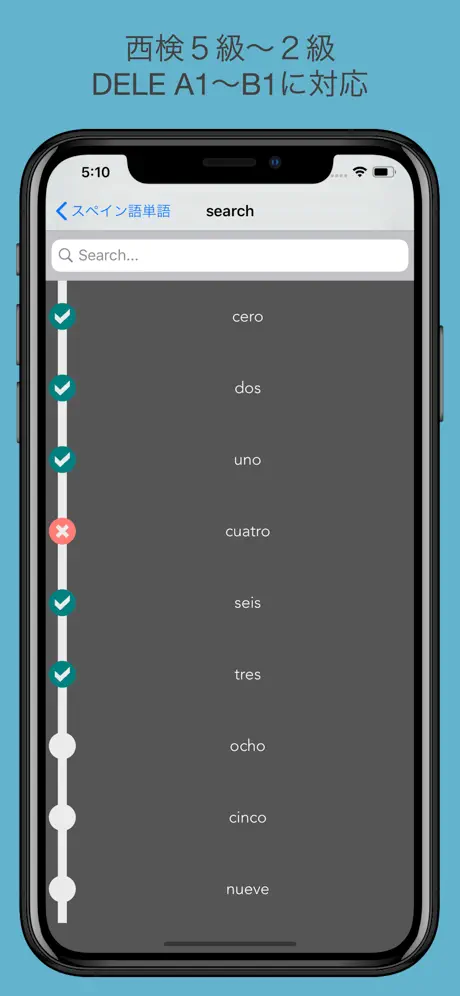 基本的に満足してます。 記憶のため間違った単語は3問後くらいに繰り返し出題される機能を追加して欲しいです。 今年はDELE B1受験するぞー!