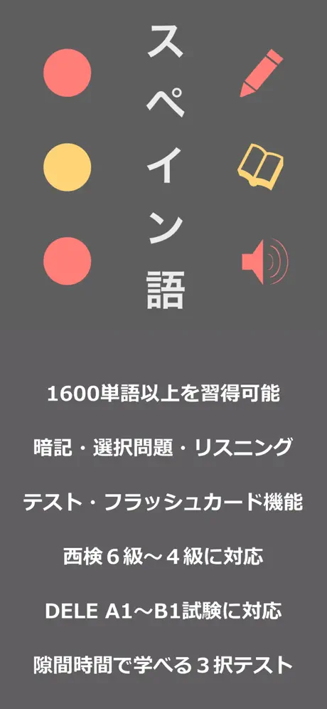 スペイン語を学習し始めて約1年と半年です。NHKの語学アプリ『スペイン語単語帳』と『NEMOスペイン語』を試しましたが、最終的に使っているのはこのアプリです。(NHKの単語アプリは音声が有料なので最終的に高額となるため、途中で使用をやめました。) このアプリの良い所は音を聞いて正解を選ぶ方式を主軸としている所です。文字を見て正解を選ぶパターンのアプリは多数ありますが、それだと耳から単語を覚えられないため、実践では殆ど役に立ちません。このアプリで単語を勉強しつつ、学校で習った事を復習し、今年の夏にはスペインの大学で語学講座に参加しましたが、周り(他の日本人)との差は歴然でした。 できれば中級レベル以降の単語アプリも出してほしいです。 他のレビューではマイナスに評価されていましたが、「1問ずつ詳細画面が出る」方式には賛成です。間違えた場合にきちんと確認が出来るので、次のアプリでもこの方式は採用してほしいです。正答率がよほどの状態ならば、詳細画面は必要ないので(かなり学習した)今となってはたいして確認をしませんが、最初の頃はこの画面をしっかり頭に叩き込む事で1つ1つ意味と音と表記を確認しました。(一概には言えませんが、たぶん、それが意味がある学習法だと思います)
