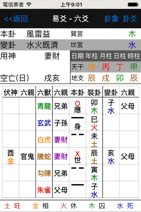 2. 结合起卦时间,排列出本卦,互卦和变卦各个卦象,根据各个卦象之间的五行关系列出吉凶。