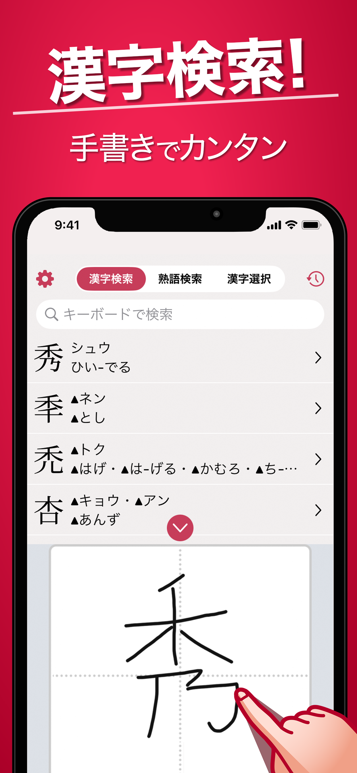 音や部首だと見つけづらい時に、漢字そのものを書いて見つけられるので、私にとって使いやすいです。
