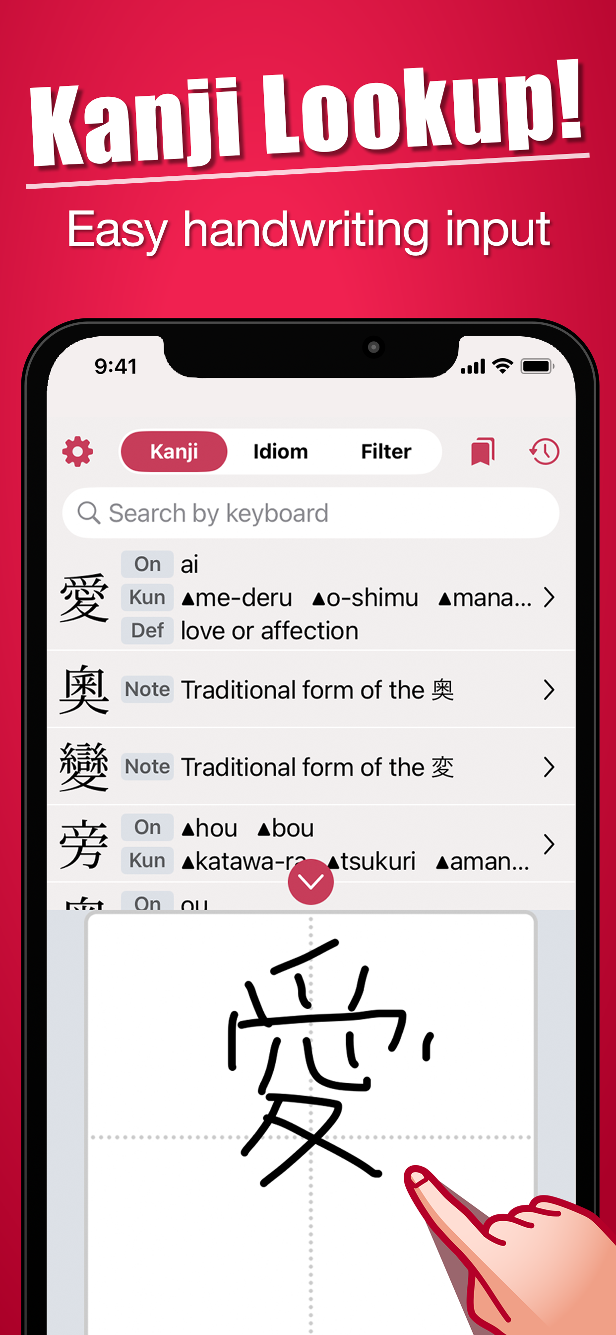 漢詩をやっているので、旧漢字が引ける手書きアプリを3点選んで使用してみた。その中で群を抜いて優れた手書き辞書だった。 惜しむらくは、有料版で良いから宣伝表示無しが有れば★5だった。