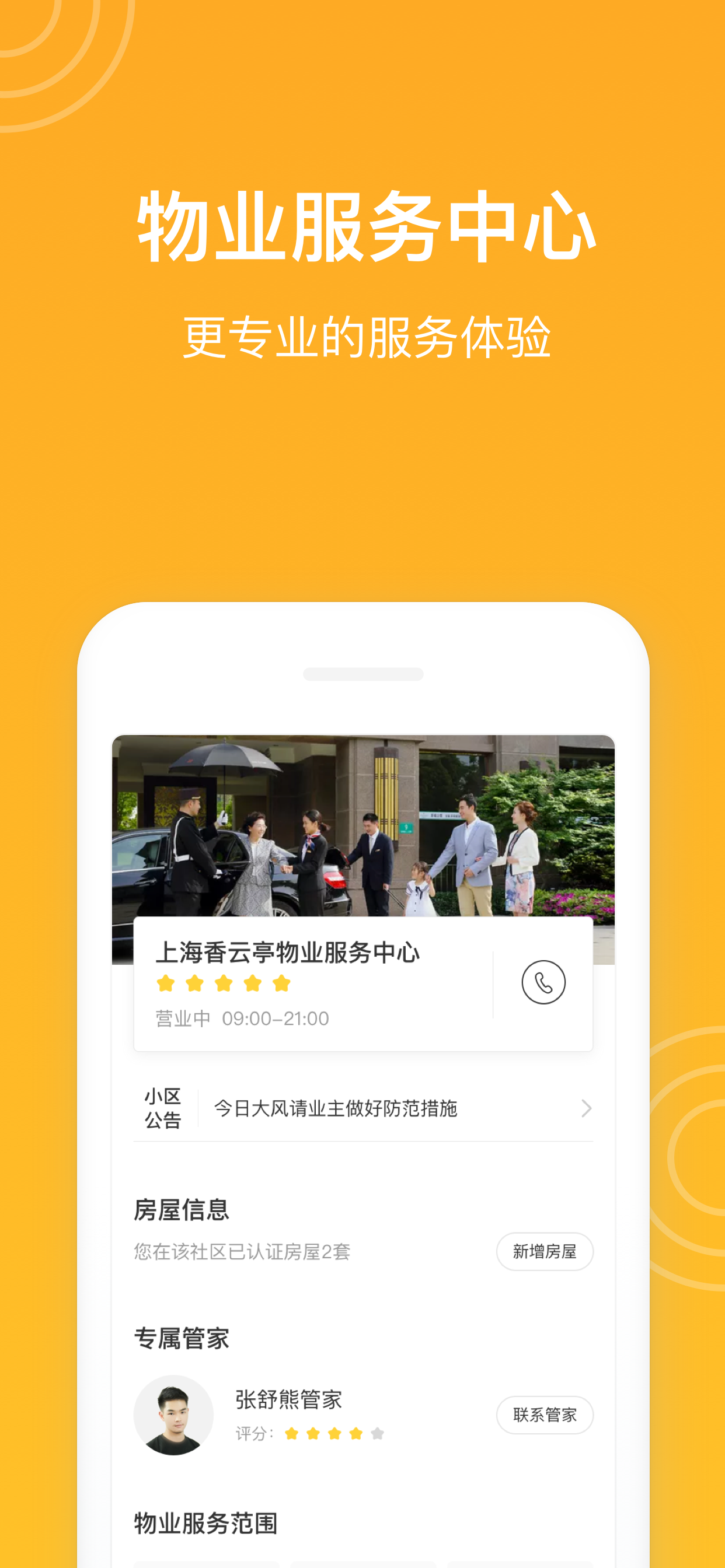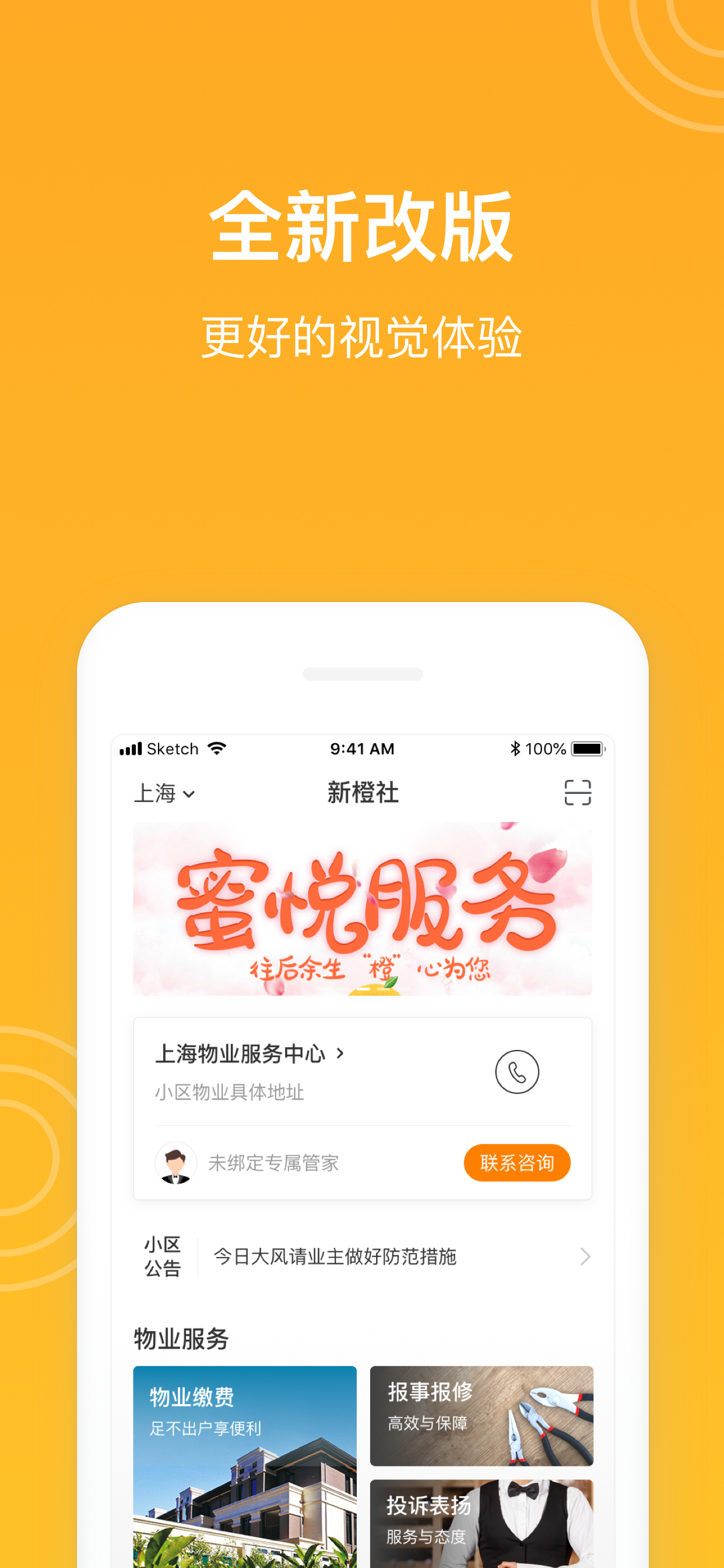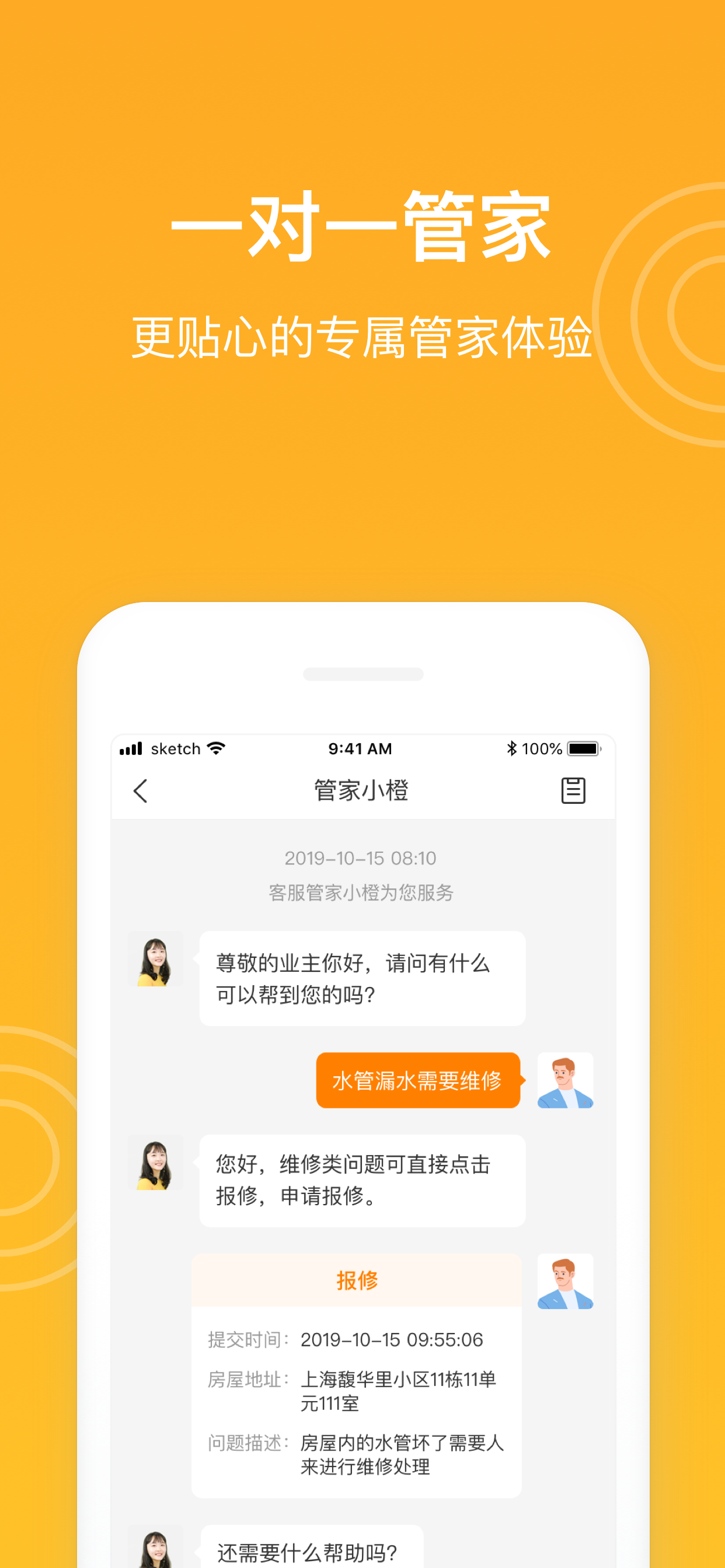 【橙管家】报修、投诉、咨询轻松上报,二千多社区服务人员随时候命,全力以赴解决业主的每一个需求。