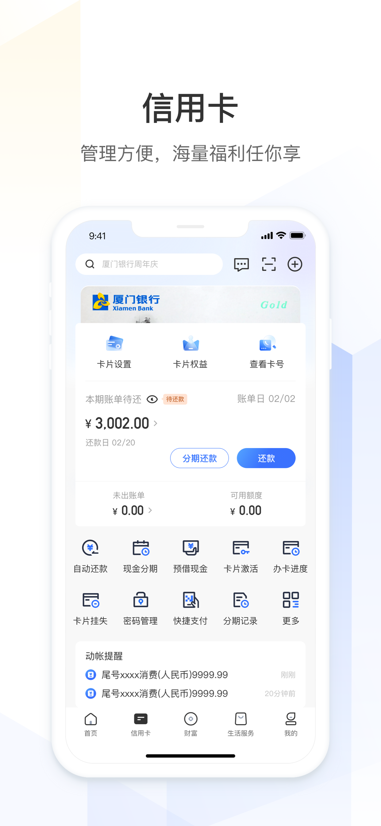 - 信用卡:支持信用卡申办、还款、分期、账单查询等;多样的信用卡优惠活动。