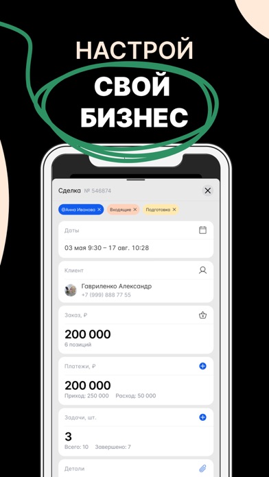 - Контроль финансов — заноси платежи не только по клиентам, но и по бизнесу в целом.