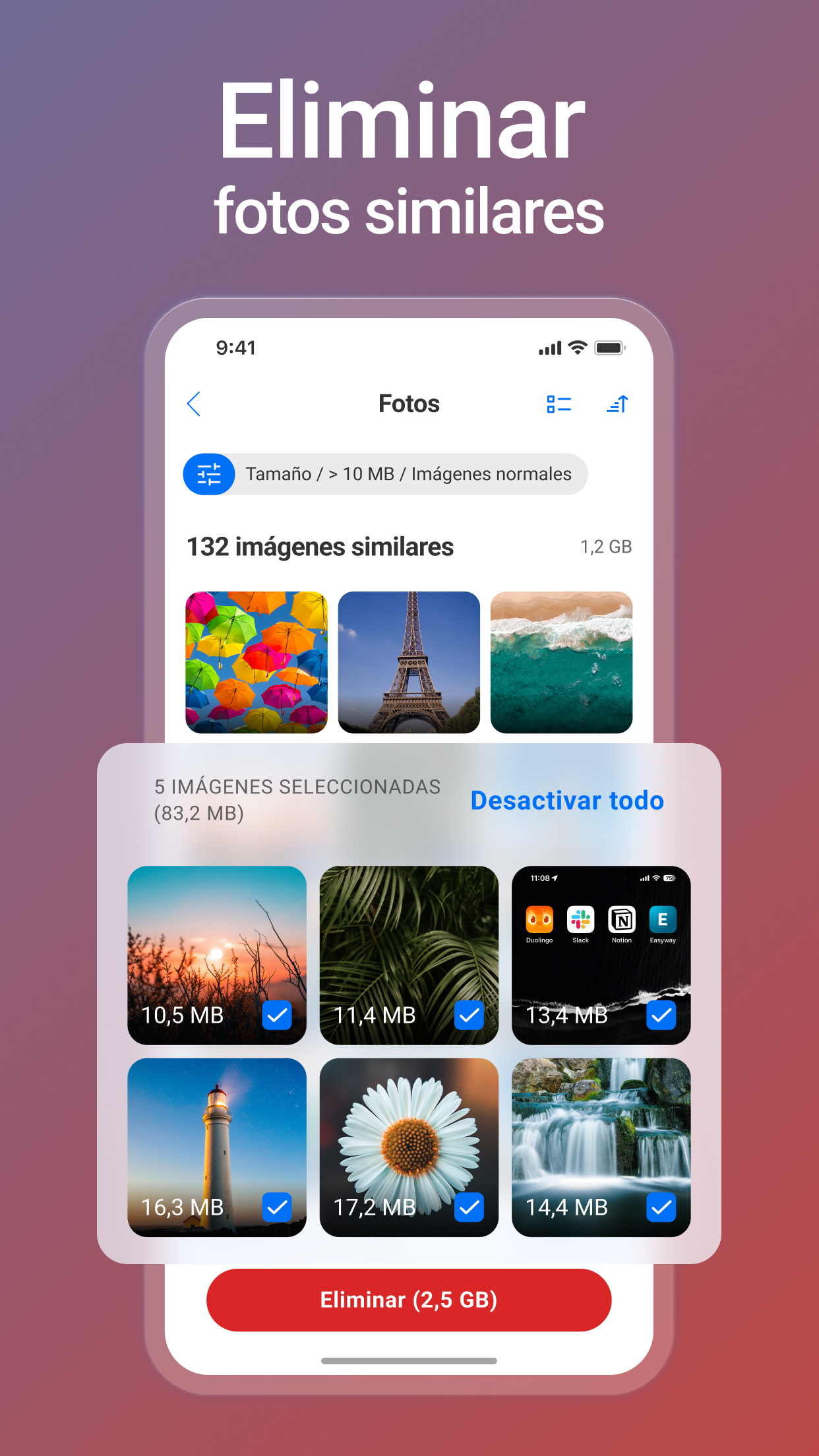 - Limpiador de archivos multimedia: encuentre y elimine fotos, imágenes, capturas de pantalla y vídeos de gran tamaño, no deseados, duplicados o similares.
