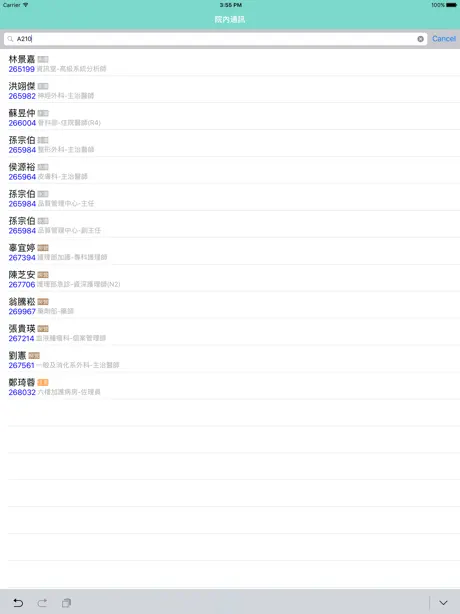 6. 通訊錄功能:與醫院員工資料連結,建立便捷的通訊路徑,在行動裝置上即可依簡單關鍵字搜尋出要找的人來進行通話,可減少繁瑣的找電話工作。