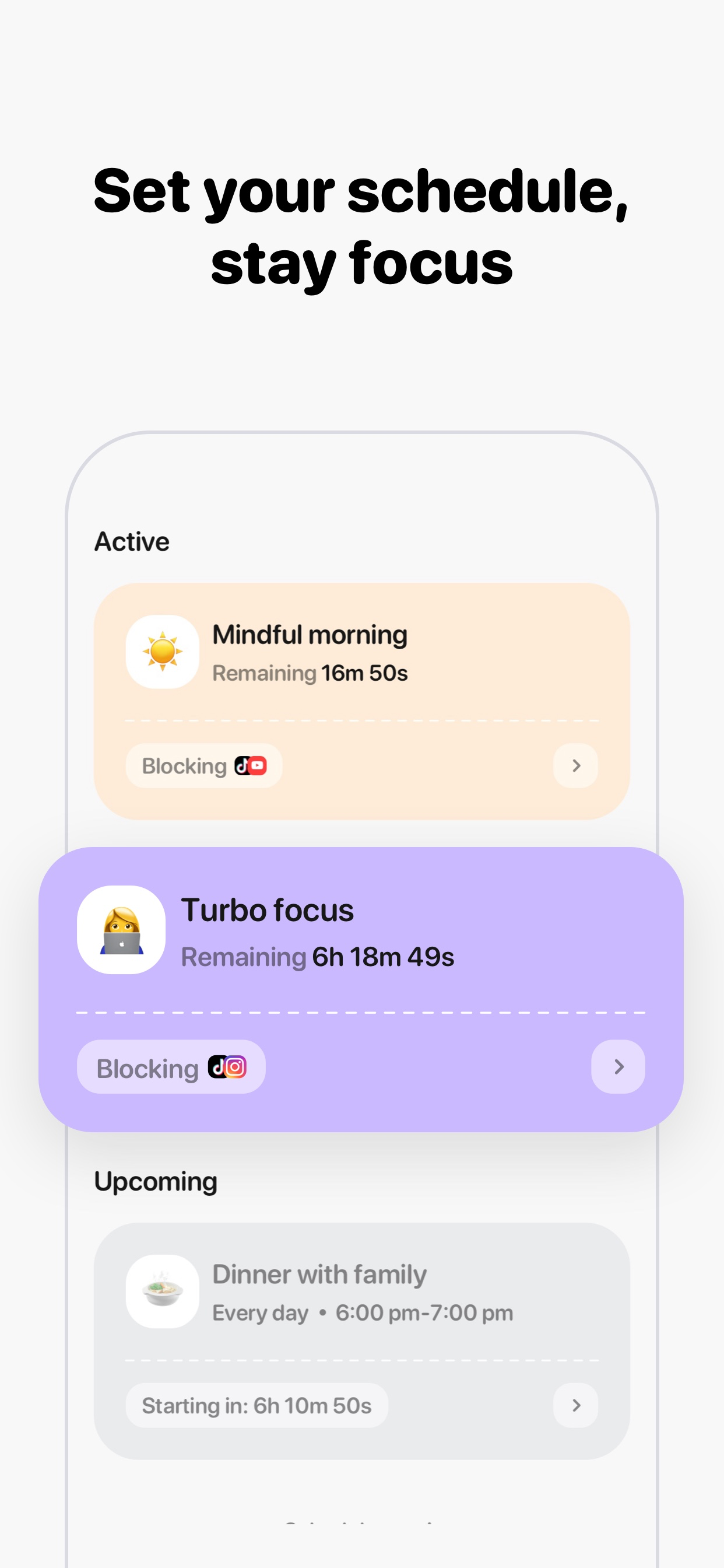 ◉ Blocking distracting apps on your own schedule