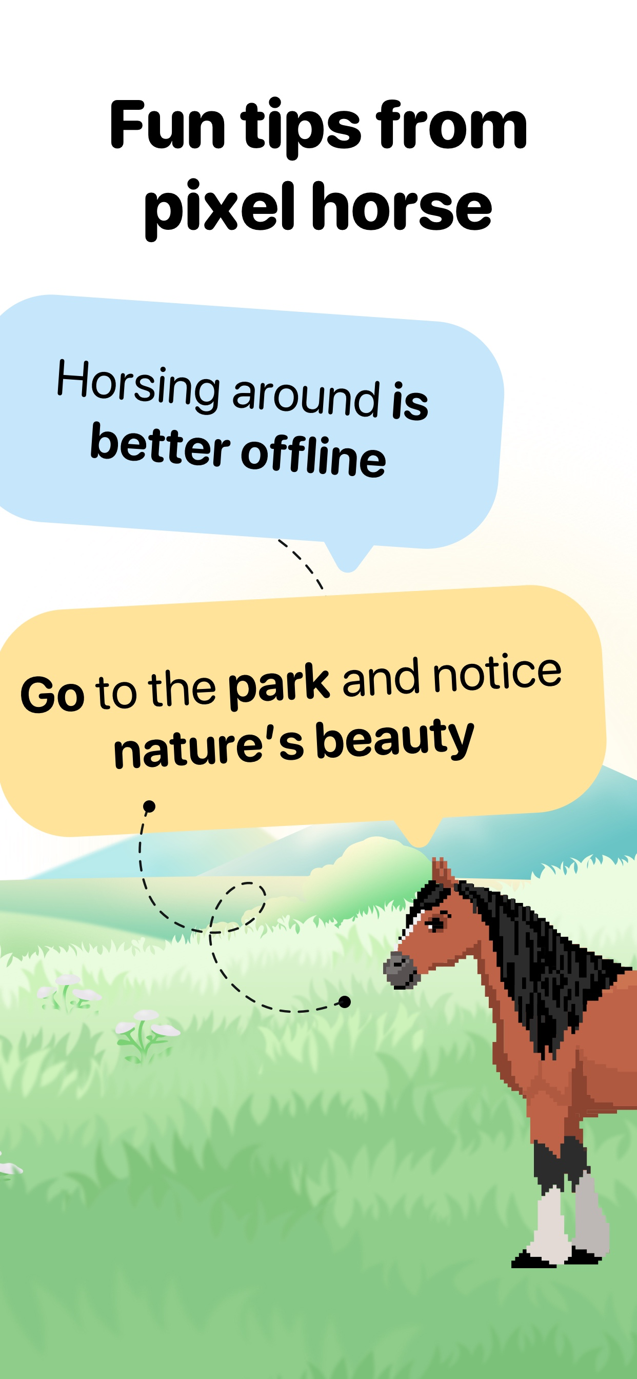 Ready for a dopamine detox? We’ve got you covered with a special mode designed to help you reduce time spent on social media, games, and all those distracting apps. And yes, your pixel horse will be there to support you with tips, jokes, and motivation along the way. Don’t worry, it’s a virtual horse, but the results are very real!