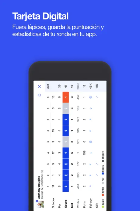 - Tarjeta de puntuación digital – Registra puntuaciones, putts, fairways alcanzados y estadísticas GIR digitalmente en tu smartphone o smartwatch.