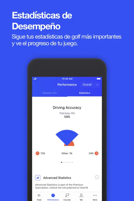 - Estadísticas generales – Estadísticas de rendimiento sobre tu precisión en los drives, greens en regulación, juego corto y putting.