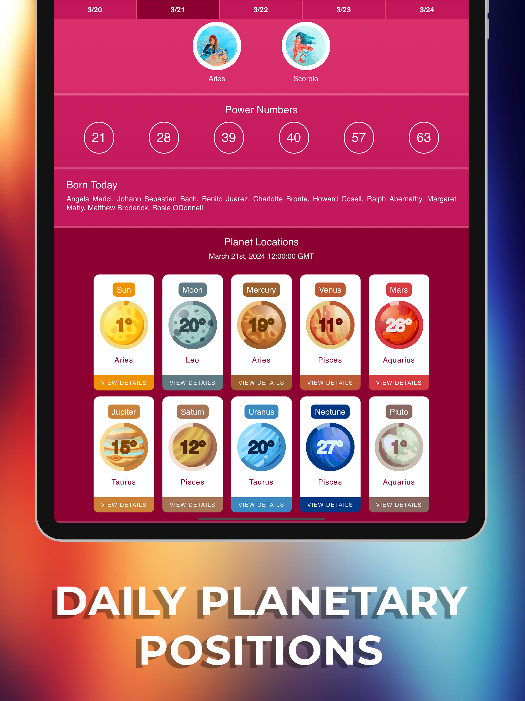 - Explore the horoscopes & predictions for all 12 zodiac signs (Aries, Taurus, Gemini, Cancer, Leo, Virgo, Libra, Scorpio, Sagittarius, Capricorn, Aquarius, and Pisces) within this astrology app.