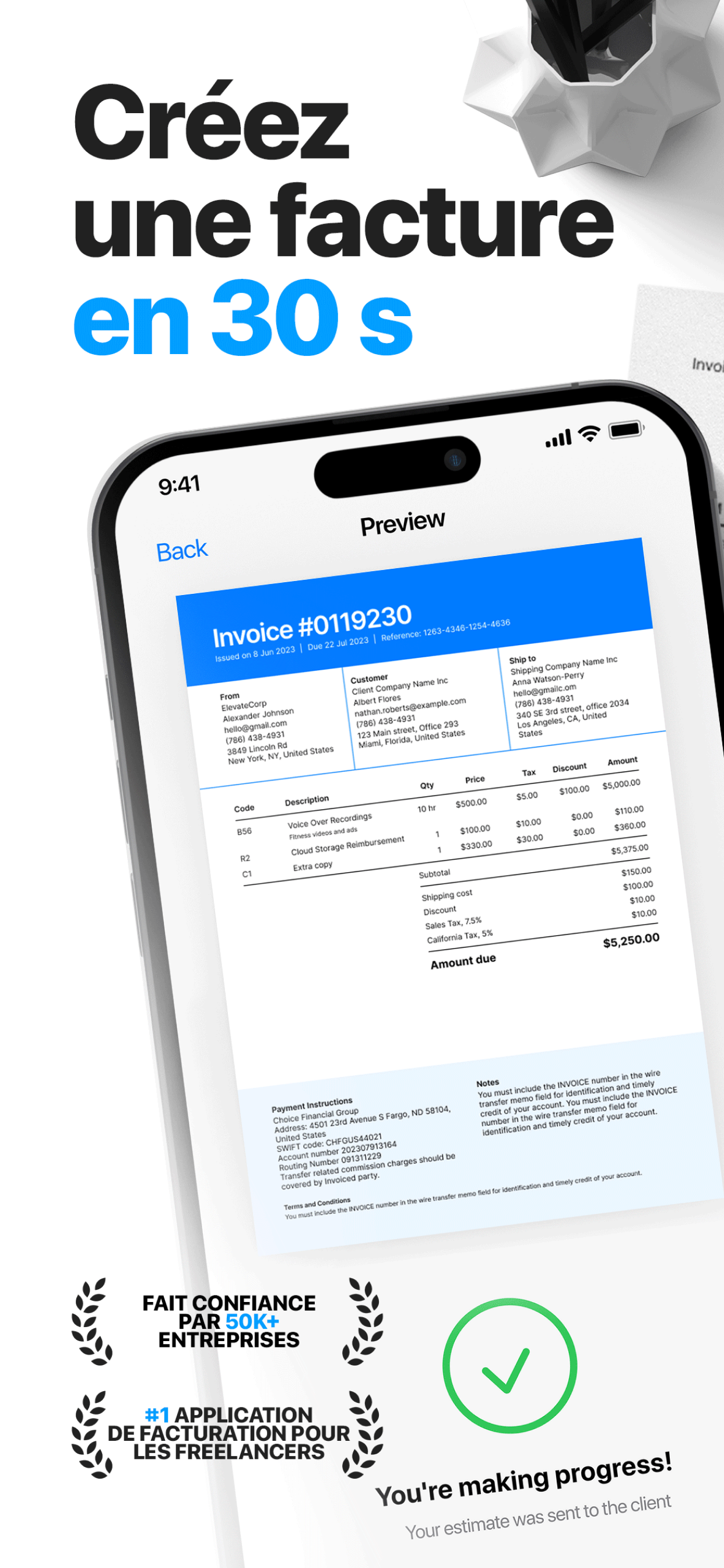 - Calculs automatiques : évitez les erreurs manuelles. Saisissez vos services ou produits, définissez les prix et laissez l'application effectuer les calculs des taxes, des remises et des totaux.