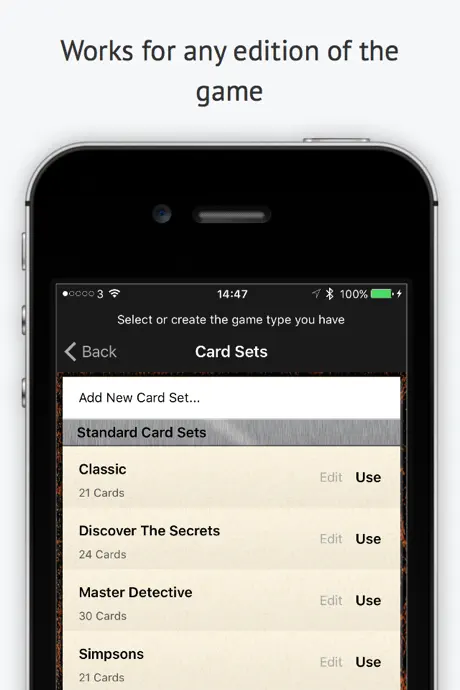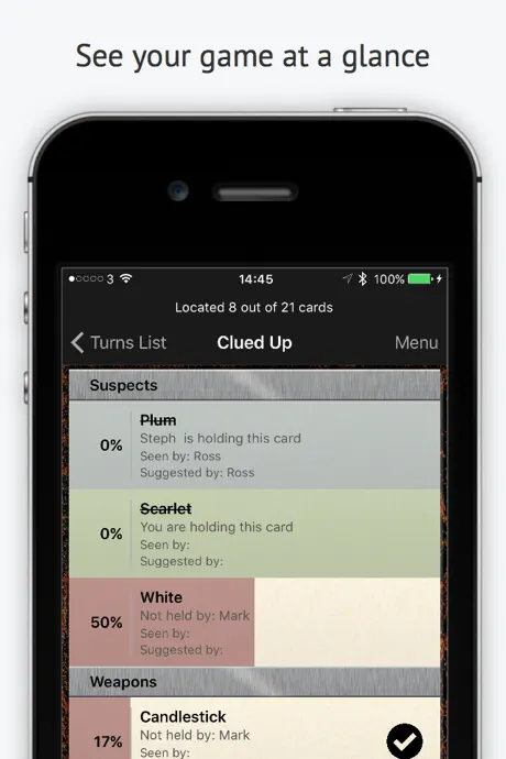 The iPad version of the app Clued Up is fine, but Klued Up does not work right in any of the 21 card sets with 2 players. 21 cards minus 3 for the Confidential envelope leaves 18 cards. So 9 cards per player. The iPhone version seems to think you get 7. So it never calculates anything correctly, particularly rooms. It lets you enter 9 of 7 cards okay but you have to go with your gut and choose a room with 40% odds not 100%. It seems okay with 3 or 4 players. I finally bought another app for the iPhone. I used to graph all this out as a logic problem so this does beat that, but only on an iPad apparently. I was contacted by the developer, so they are responsive, kudos. On box technically the game is for 3-6 players only. 2 player version of the rules include setting aside some cards to look at when no one can prove anyone wrong, as a sort of virtual 3rd player. But the iPad and iPhone apps are still not consistent with each other. The developer said that they may put in a setting. Changing to 4 stars. We only have so many iPads and iPhones around the house when everyone is playing but this at least only effects 2 player mode.
