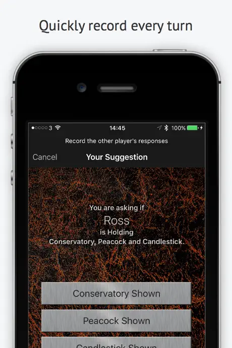 We have Clue FX, the electronic model that talks to you. Well, this app WOULD be perfect if you could change ONE THING. When you click on accusation, you should be able to click on who is accusing, and then click who showed what. In our version, you are not accusing just one person of holding 3 cards. You are accusing the whole table and anyone holding one of those 3 cards must show you that card. But this app makes you only accuse one person.