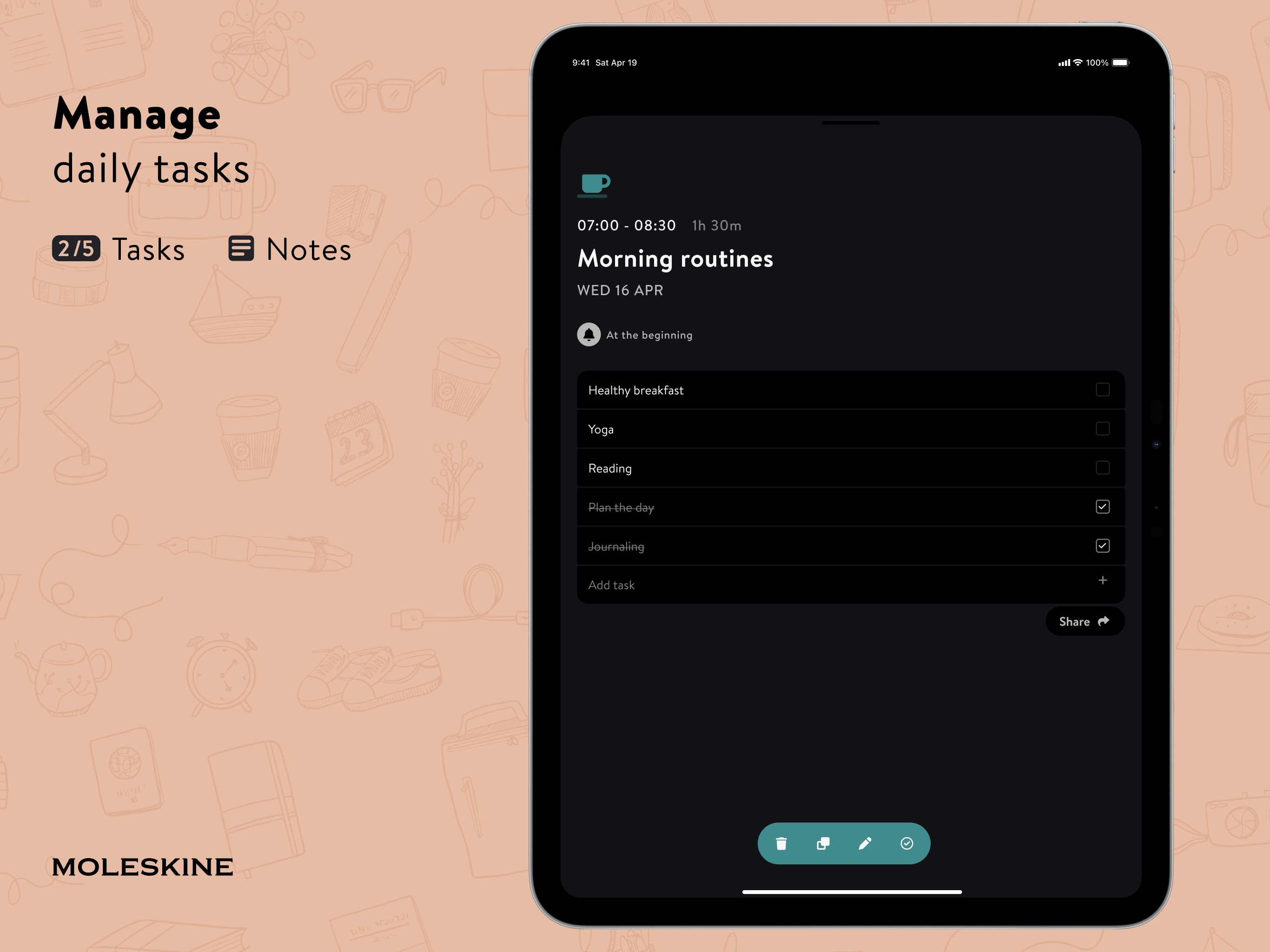 Empower your planning by marking tasks as completed and adding a personal touch with customizable icons, colors, subtasks, and notes.