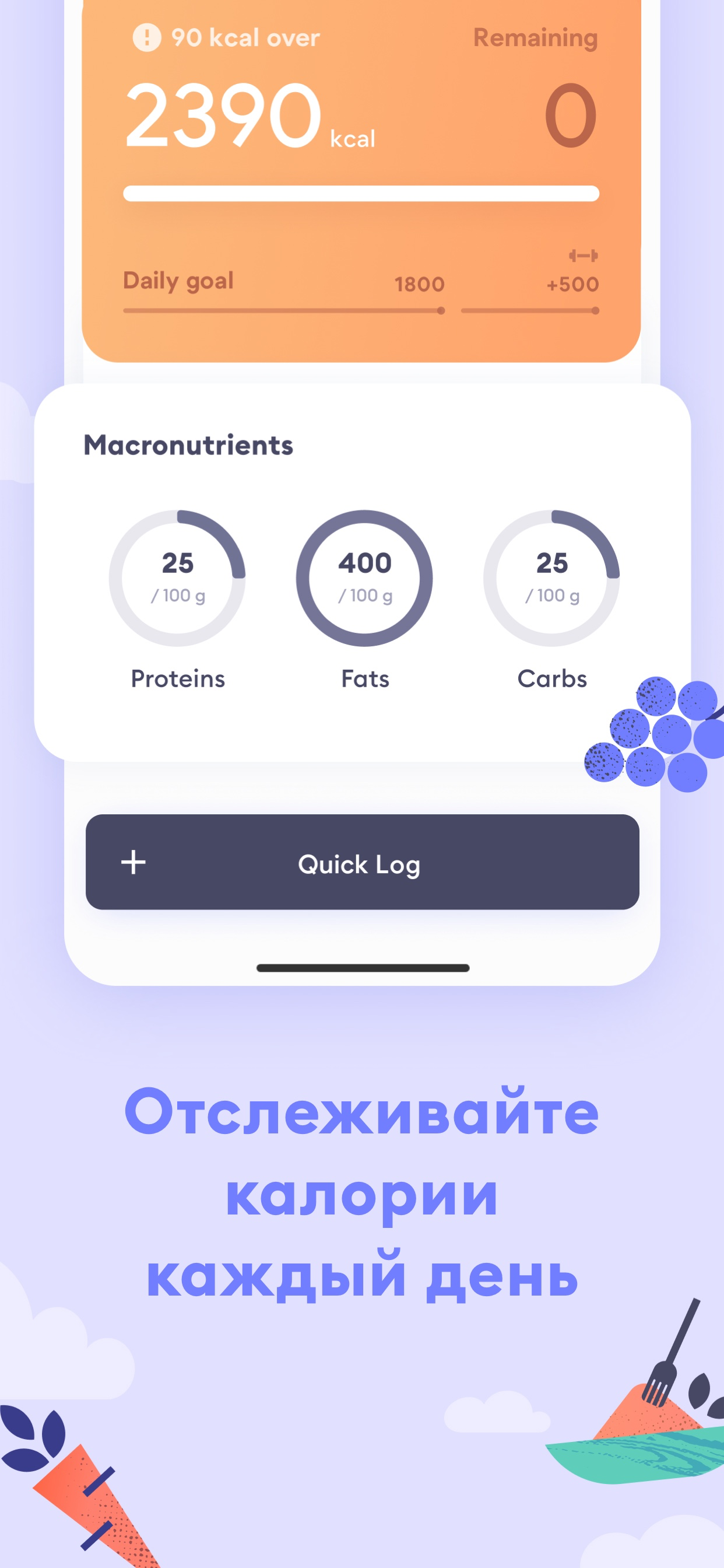 - Daily food diary and macro tracker. The key to the new, healthier you. Break down everything you eat by day, meal, and macronutrients. Swipe through the days and plan future weeks by logging your meals in advance. Receive calorie intake recommendations and track your path towards your target weight. Incorporate calories burned off through exercise, so you always have the full picture of how your workouts affect your progress.