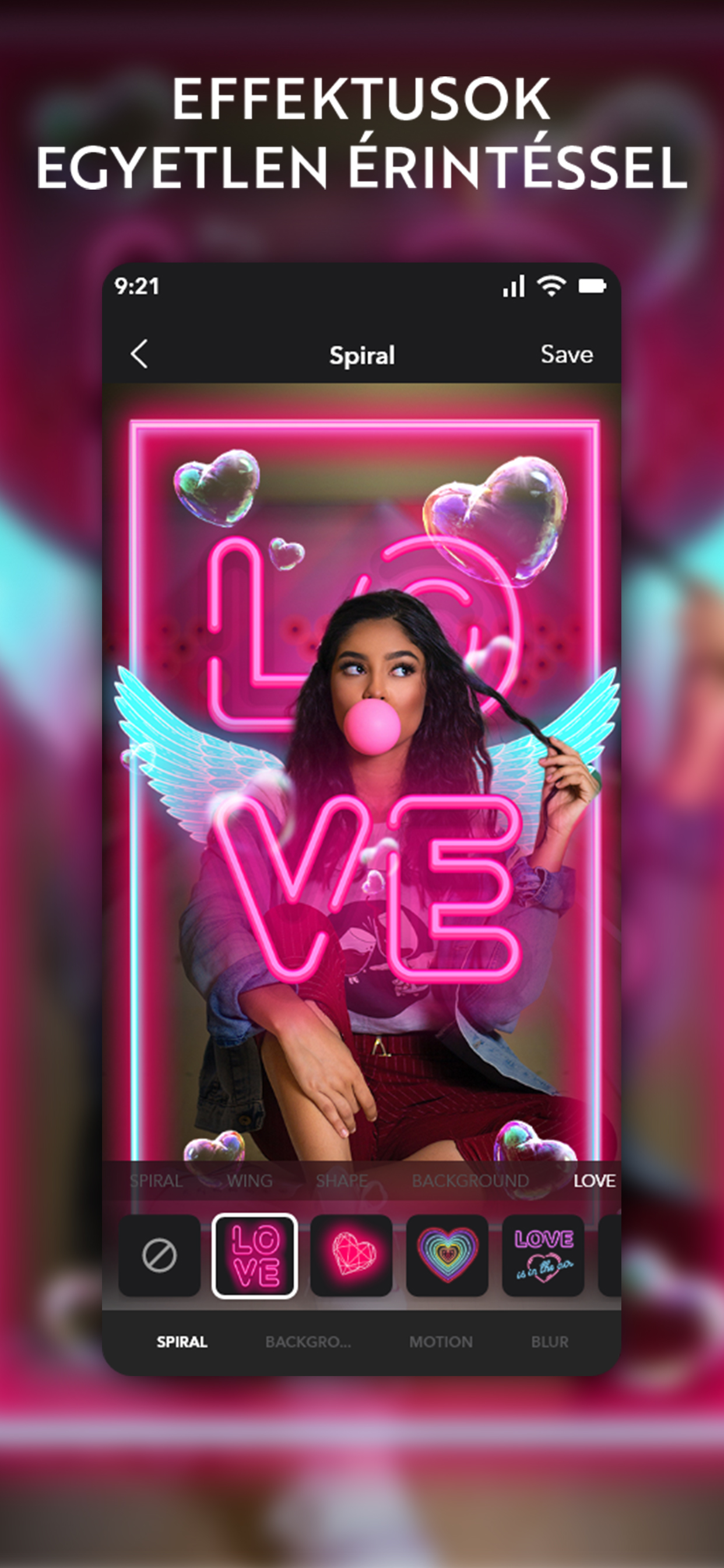 A meglepő AI spirálszerkesztő hatalmas mennyiségű neon spirál opcióval rendelkezik. Emoji háttérrel és színes képkeretekkel csodálatos képeket készíthet. Kombinálja a neon effektusokat és a retro szűrőt a neon képkeret gyűjteményekkel a kép stílusos szerkesztéséhez. Használja a mozgáshatást és az fx effektust 3D-s fotó megjelenés létrehozásához.