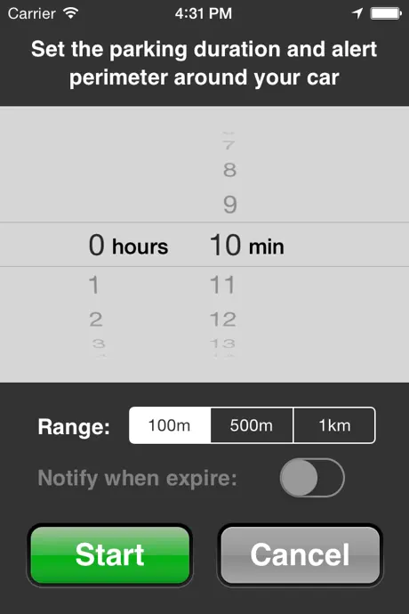 * Expiration Alarm - when parking timer expires (requires IOS 4.x and network connectivity)