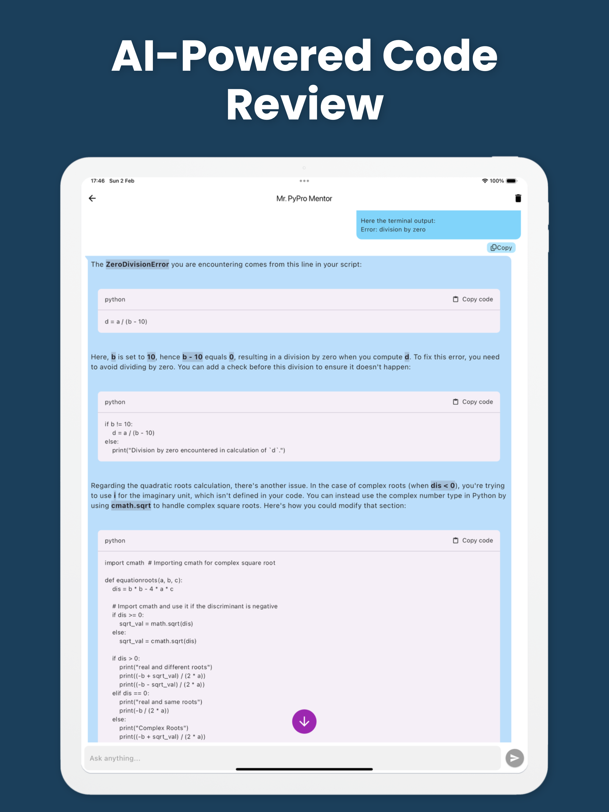 - AI Support: Get instant AI-powered assistance to debug your code, troubleshoot errors, and enhance your python skills effortlessly. Whether you're a beginner or an experienced programmer, the AI is here to help you write better code.