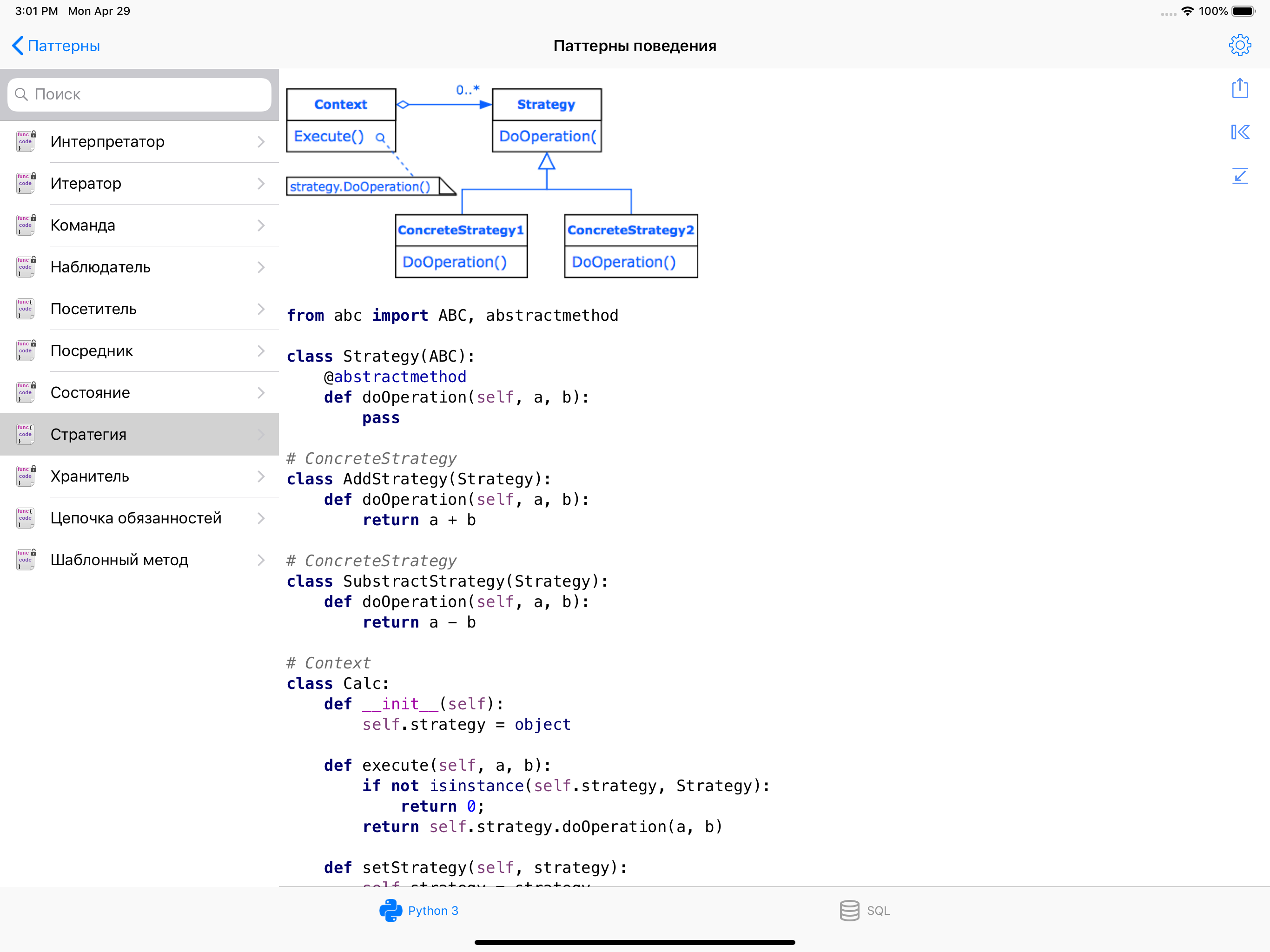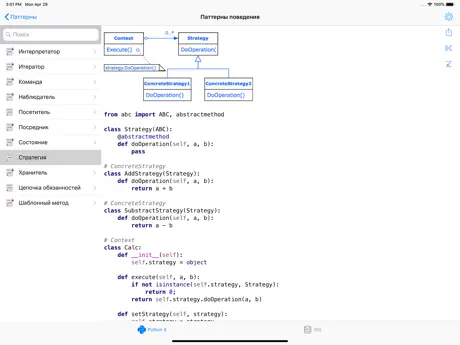Не плохое приложение. Не хватает разве что более развёрнутых описаний каждого из разделов. Например взять какой-нибудь паттерн и помимо кода и схемы написать что он обеспечивает и какие у него плюсы и минусы.