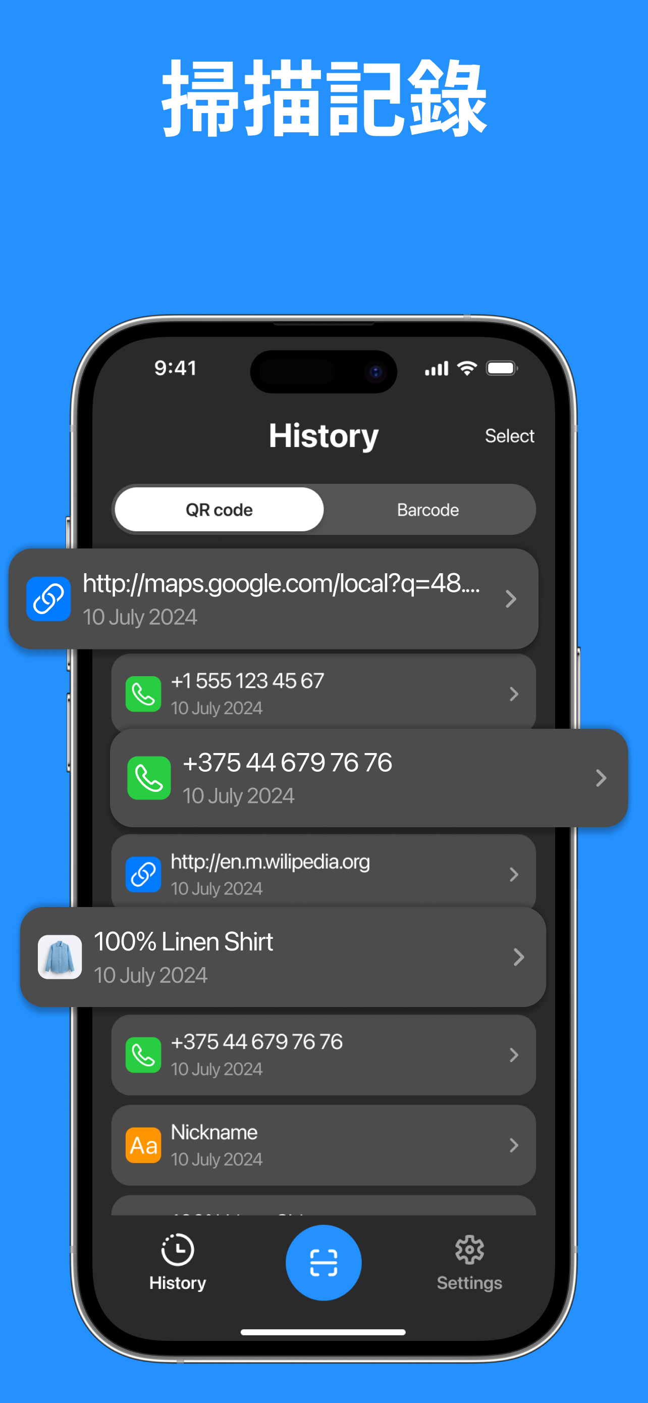 - 歷史管理: 存取所有掃描和建立的代碼的全面歷史記錄。此功能可讓您重新檢視過去的掃描,並重複使用已建立的代碼,而無需將其儲存在其他地方。