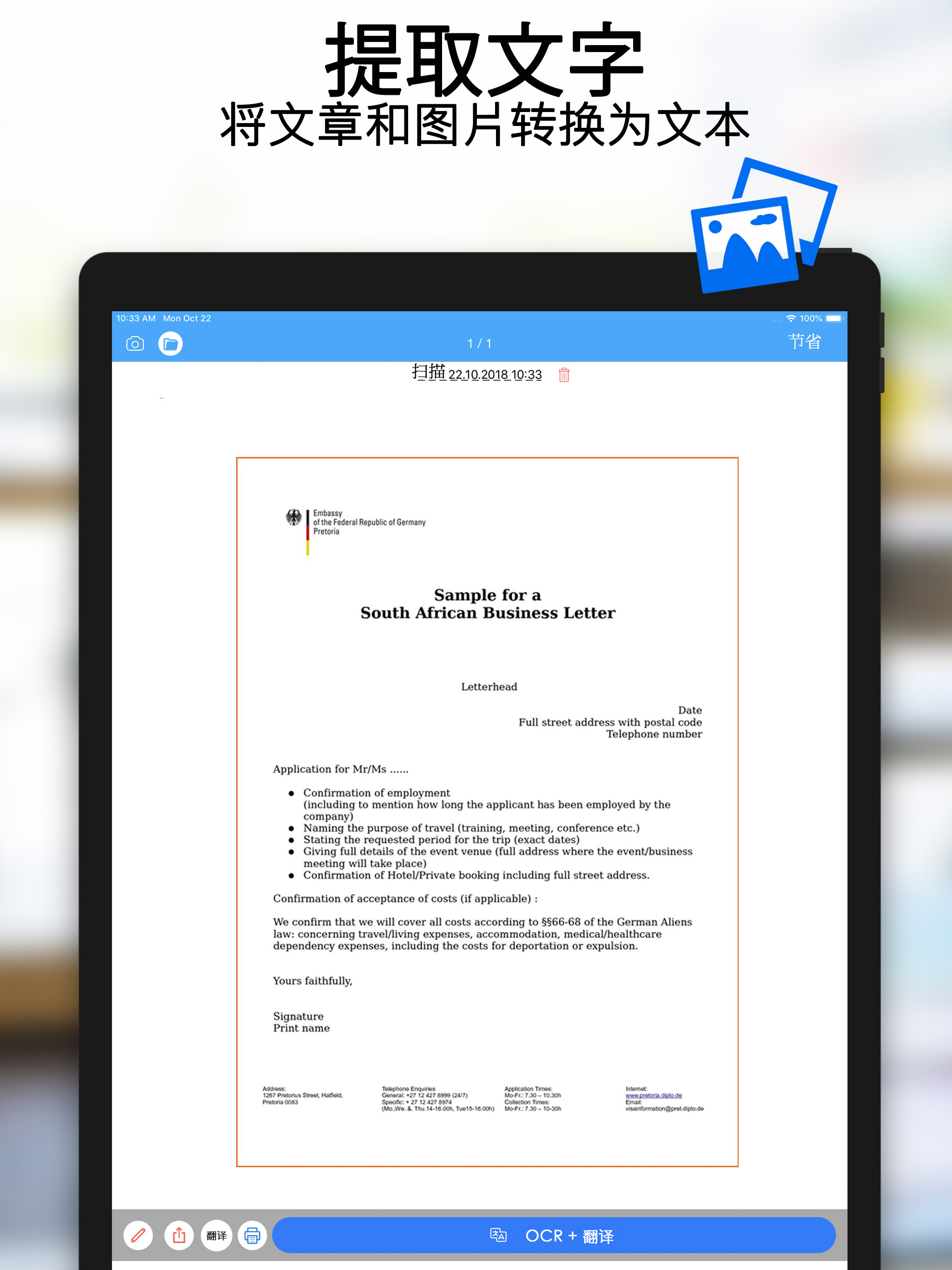 这个扫描翻译器非常好用, 扫描出来的图片非常清楚。 可以直接提取文本并转换为PDF文件。 可以直接打印出来。翻译功能也很强大。 还可以用来签电子合同,并且可以马上将文件分享给别人,或者传输到网盘。 好用,值得推荐!