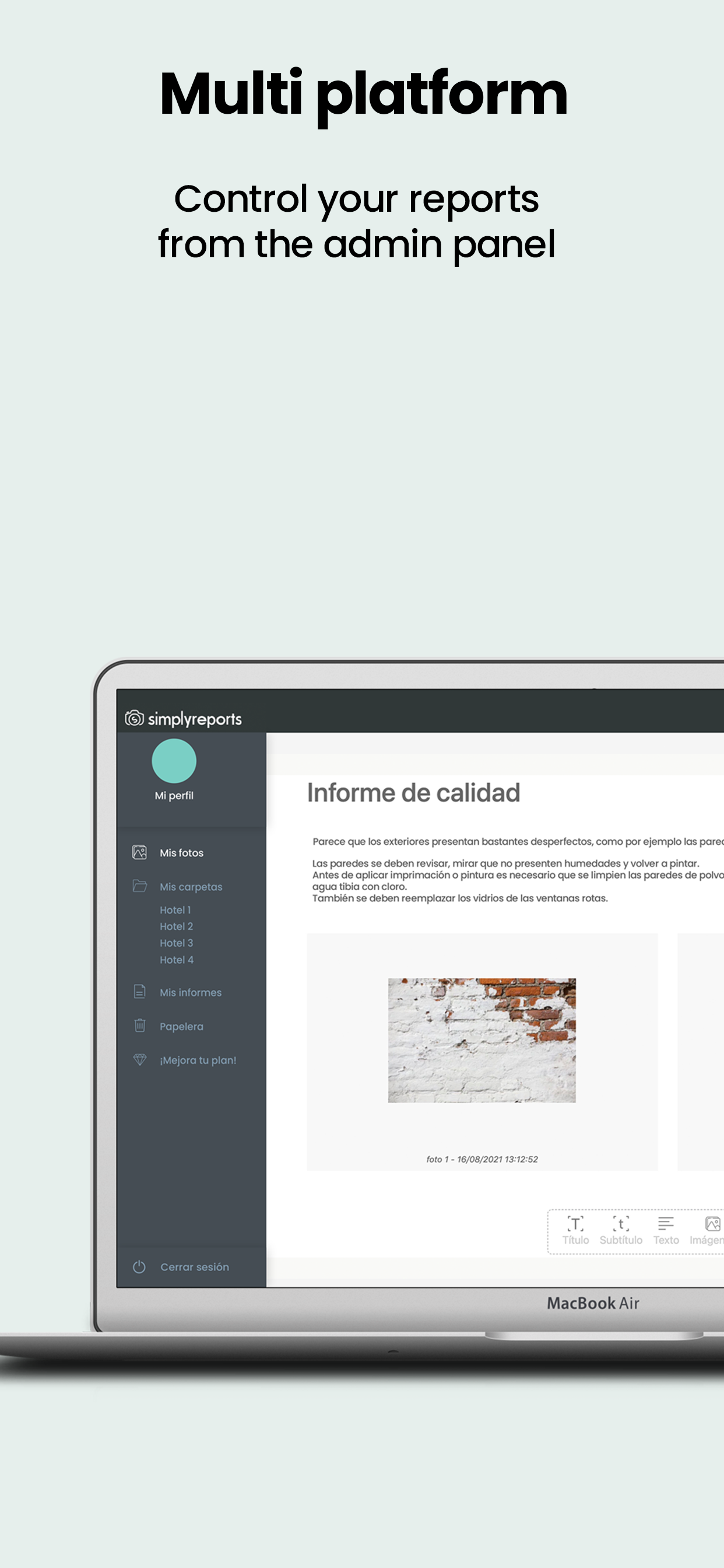 2. Your administration panel. Where you can organize your photos in folders, and add comments. In the same way, you can generate reports, share them and store them in an orderly way.