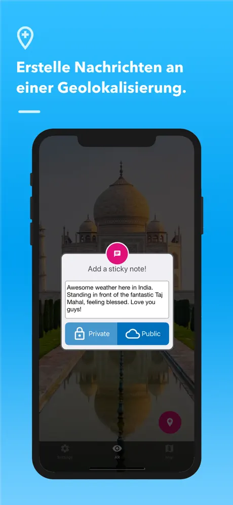• PRIVATE NACHRICHTEN: Nutze die App im privaten Modus, um für dich wichtige Events, Orte, Geschäfte, Gebäude, Geschehnisse, Objekte etc. zu markieren und mit Inhalten zu versehen, die nur Du allein sehen kannst. Die Inhalte werden als private Nachricht nur auf Deinem eigenen Gerät gespeichert und Niemandem sonst zugänglich gemacht. Private Inhalte werden auch nicht über das Netzwerk verteilt. Schon jemals Dein geparktes Auto nicht mehr gefunden? Markiere es ab sofort mit Sticky Notes AR!