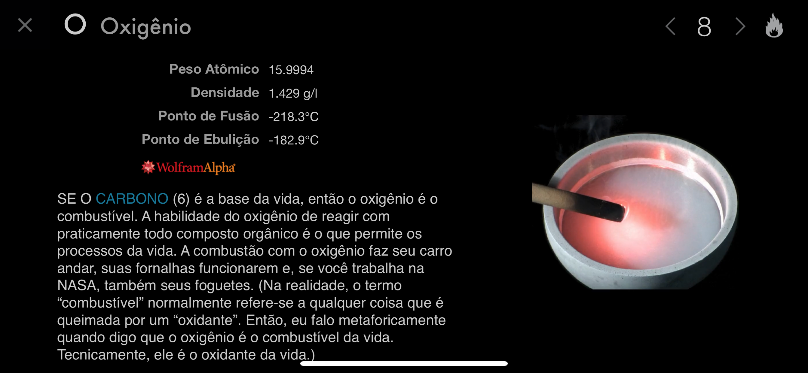 Inicia-se com uma tabela periódica viva onde todos os elementos são apresentados numa amostra que gira suavemente. Para ler sobre o estanho, toque no soldadinho de chumbo. Para ler sobre o ouro, toque na pepita de ouro. Imediatamente verá a amostra a ocupar quase todo o ecrã, fotografado com uma nitidez impressionante e a girar em círculo completo à frente dos seus olhos. Além disso, tem uma coluna de factos e imagens podendo, cada um deles, ser tocado para trazer riqueza de detalhes e informação atualizada através do motor computacional de conhecimento Wolfram|Alpha.
