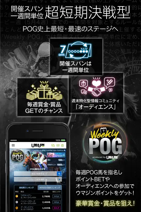 POGとはペーパーオーナーゲーム(Paper Owner Game)の各頭文字を取ったもので、実在する競走馬を参加者が仮想馬主として選択&所有。実際のレースで競走馬が得た獲得賞金をポイントに変換し、その高低を参加者間で争うゲームです。UMAJIN.netが主催する「Weekly POG」では開催スパンを一週間単位に定め、POG史上例をみない超短期決戦型POGをご体感いただけます。所定の条件を満たしたプレイヤーには、豪華賞品をプレゼント!