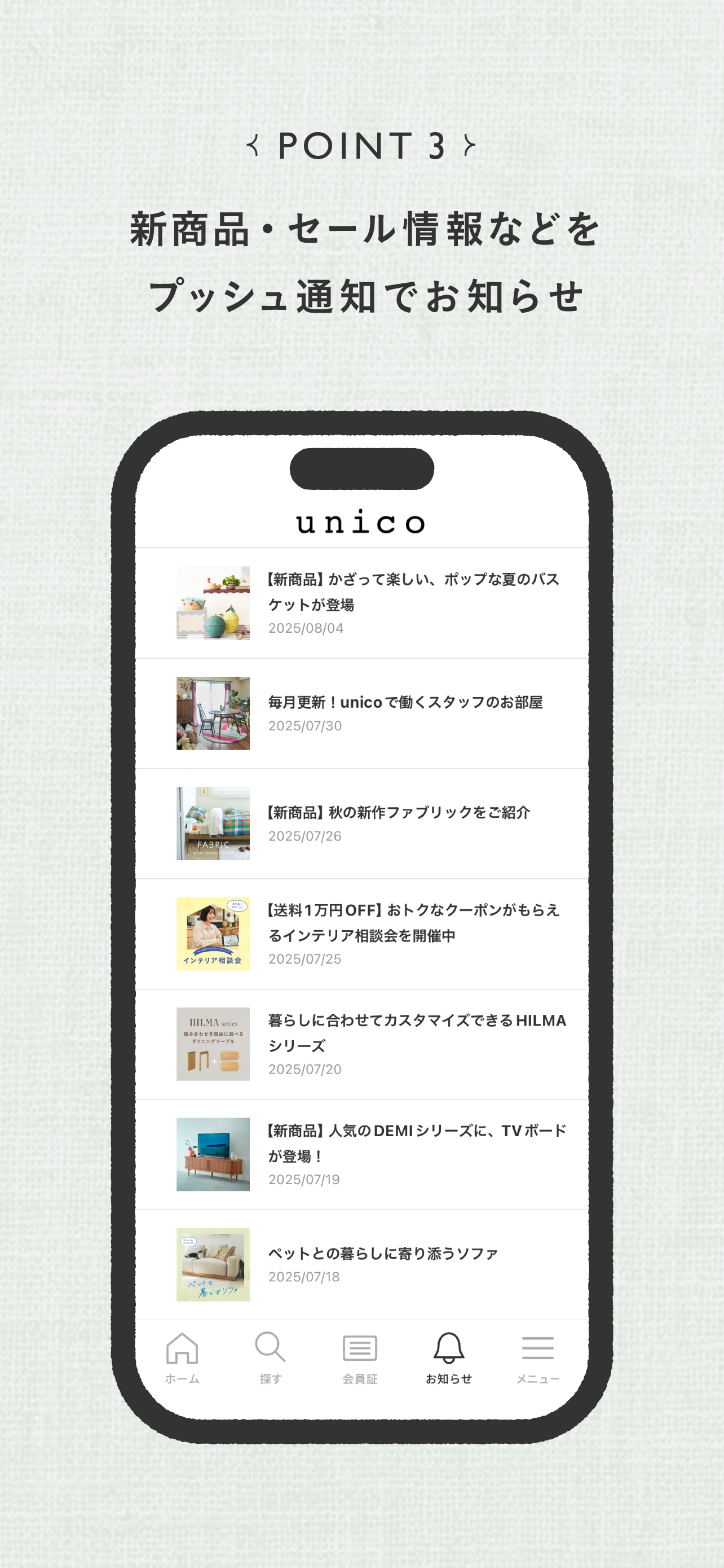 新商品やお得なキャンペーン、家具のコーディネート情報などをタイムリーにお届けします。