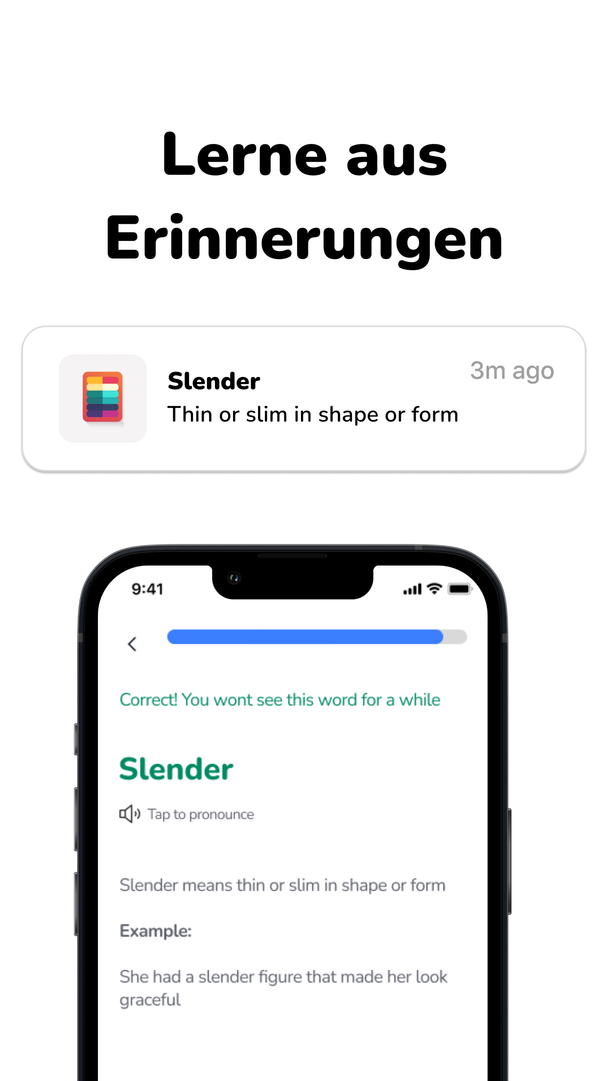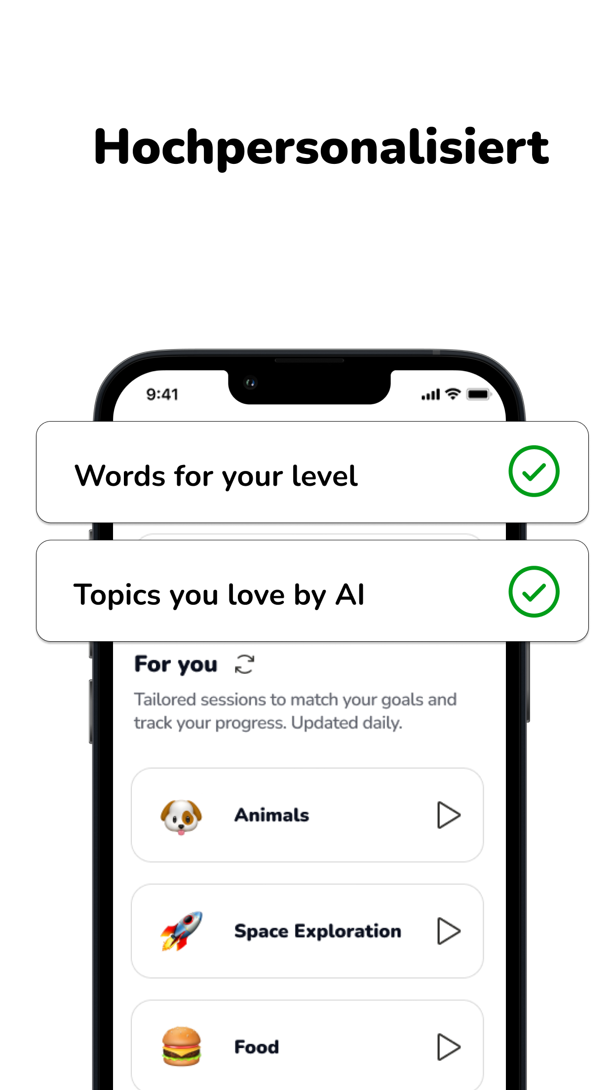 Die gesamte Wortliste wird mit unserer KI-Technologie ausgewählt und definiert, die Ihren Fortschritt, Ihre Fehler und Ihr Niveau analysiert, um Ihnen jeden Tag interessante Wörter zu liefern.