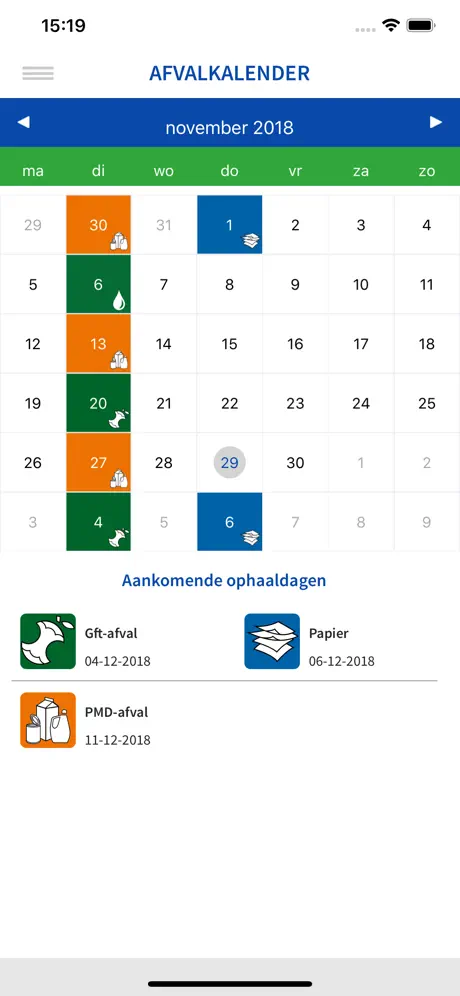 Op dit moment zie ik voor mijn postcode alleen de ophaaldata voor papier in de app. Niet de data voor groen en grijze container. Niet voor toekomst, ook niet meer voor verleden. App al verwijderd en opnieuw geïnstalleerd, zonder effect.
