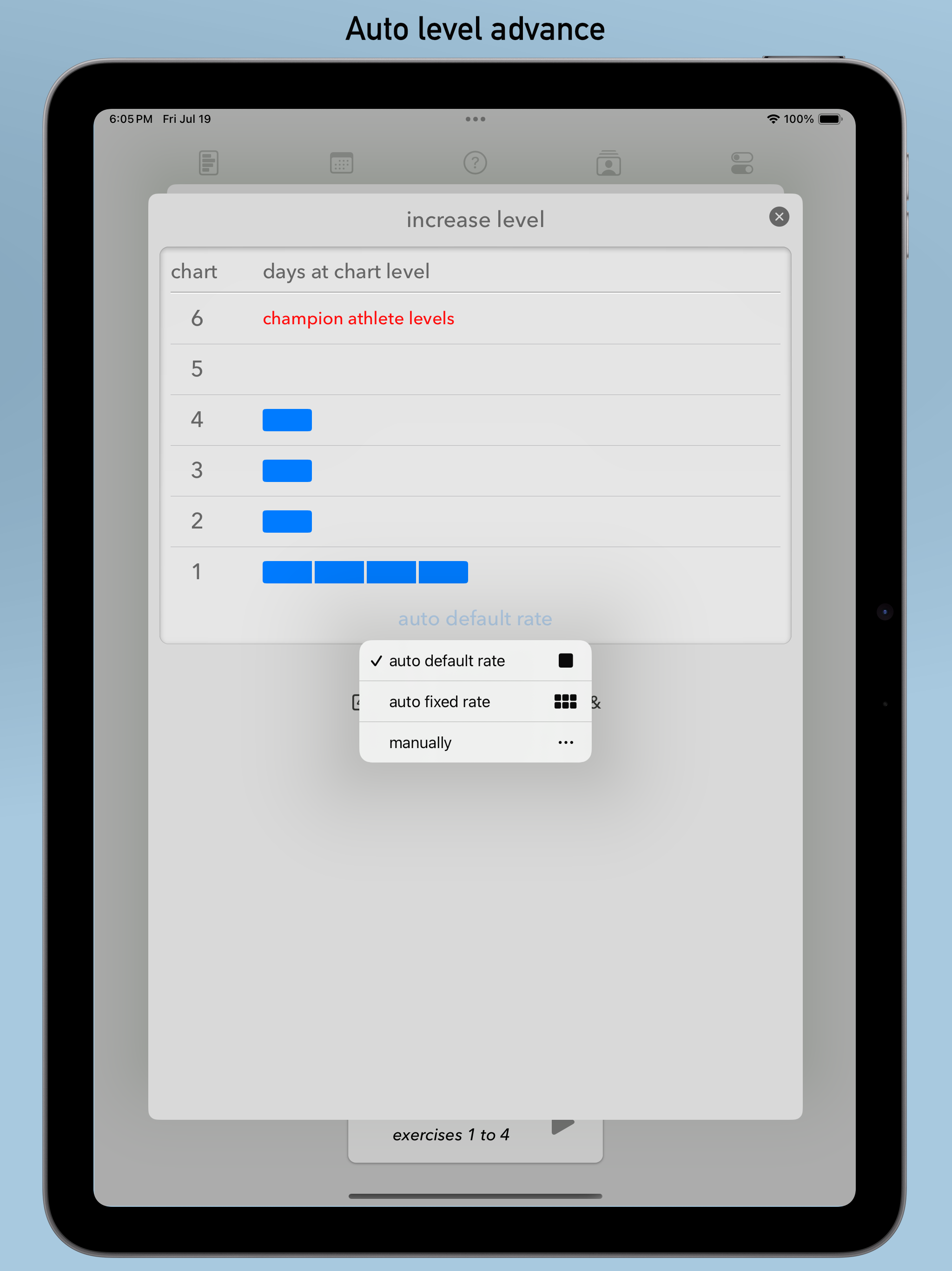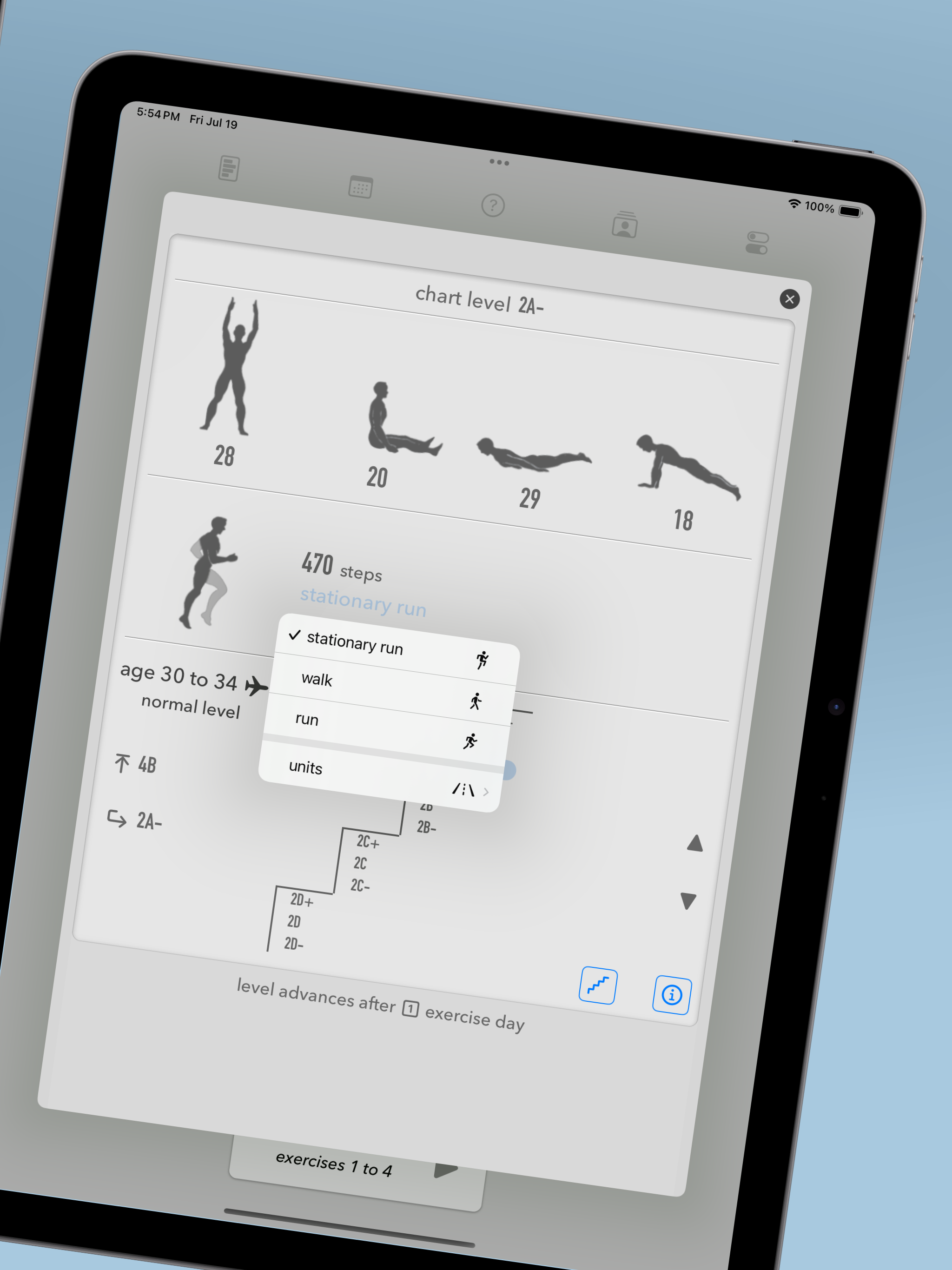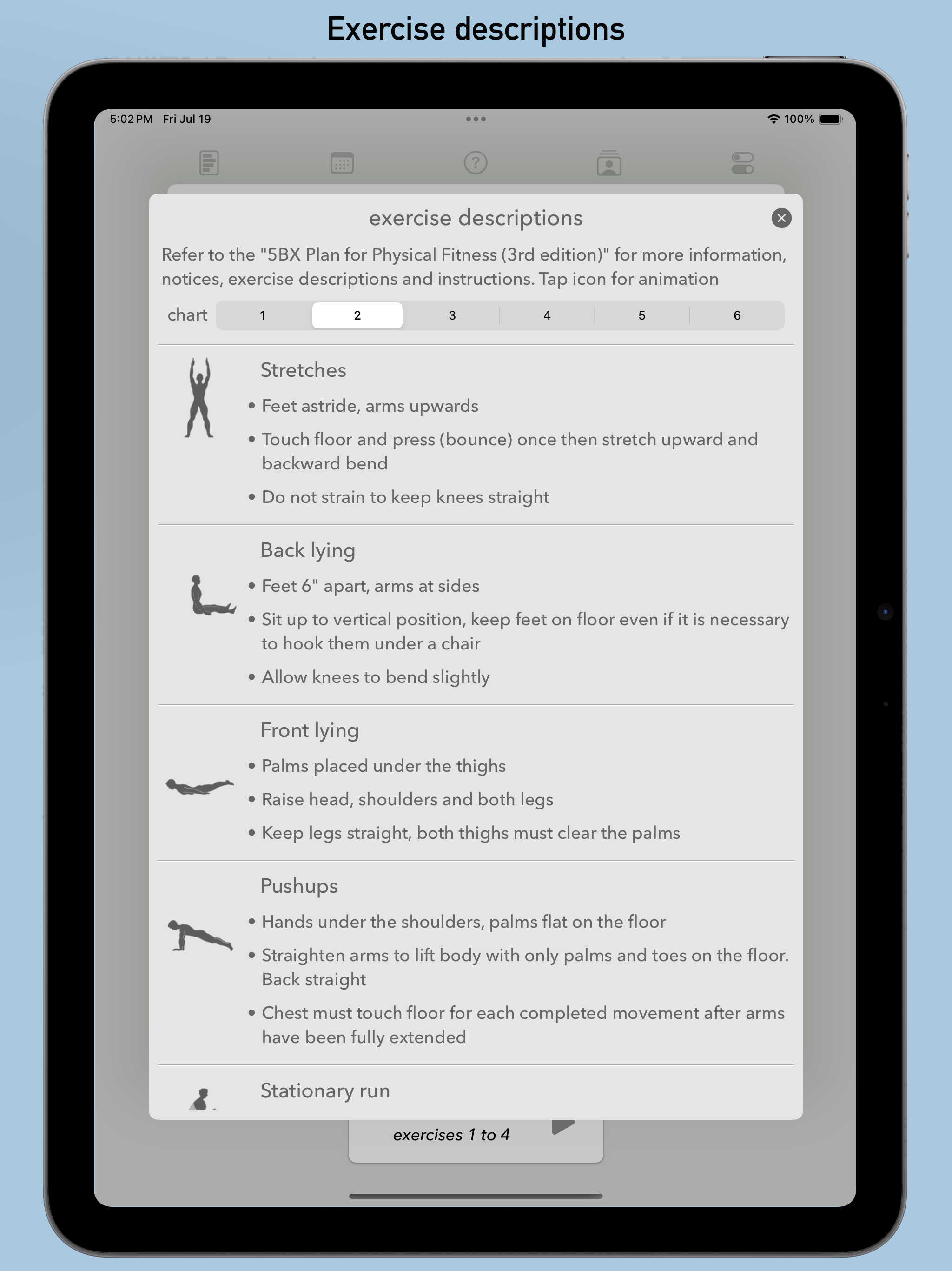 I wanted a straightforward app to step me through the 5BX program every day. This does that. The one feature missing is simple audio prompts. If it had that it would be super useful. WHAT I LIKE. I was looking for a simple 5BX app that remind me (visually) of each exercise, in sequence, for each stage of each chart. I wanted something that would help me do the routine, every day, and move me up the charts automatically. In other words, make it super simple to put in my age and, day by day, make it easy to put in the 11 minutes per day and slowly level up. No thinking. Just start the app and press go and 11 minutes later I’m done. This will do that. Almost. That’s where audio comes into play. THE AUDIO FEATURE. I wanted an audio feature to prompt me when to do another rep of an exercise and when to switch exercises. Suppose I’m on Level C. I’m supposed to do exercise 1 for 7 reps over 2 minutes, then exercise 2 for 8 reps over 1 minute, and so forth. I don’t want to be constantly checking my phone, or watching a timer, or guessing if it’s time for another rep. The audio feature would tell me I’m starting the first exercise (maybe name the exercise), then beep 7 times over the next two minutes at regular intervals, then tell me when I’m done, tell me the next exercise and give me a few seconds to get ready. When I move to level C+ it would do the same but automatically adjust the timings. I could use and app like Seconds Pro for this. And it work just fine. But every time I move to a new level I would need to manually adjust the timings for each exercise, or create a timing for each one. That’s a lot of work. The app has the information I need. It has the right idea. But without audio I’m going to use Seconds Pro instead. With audio this would be perfect.