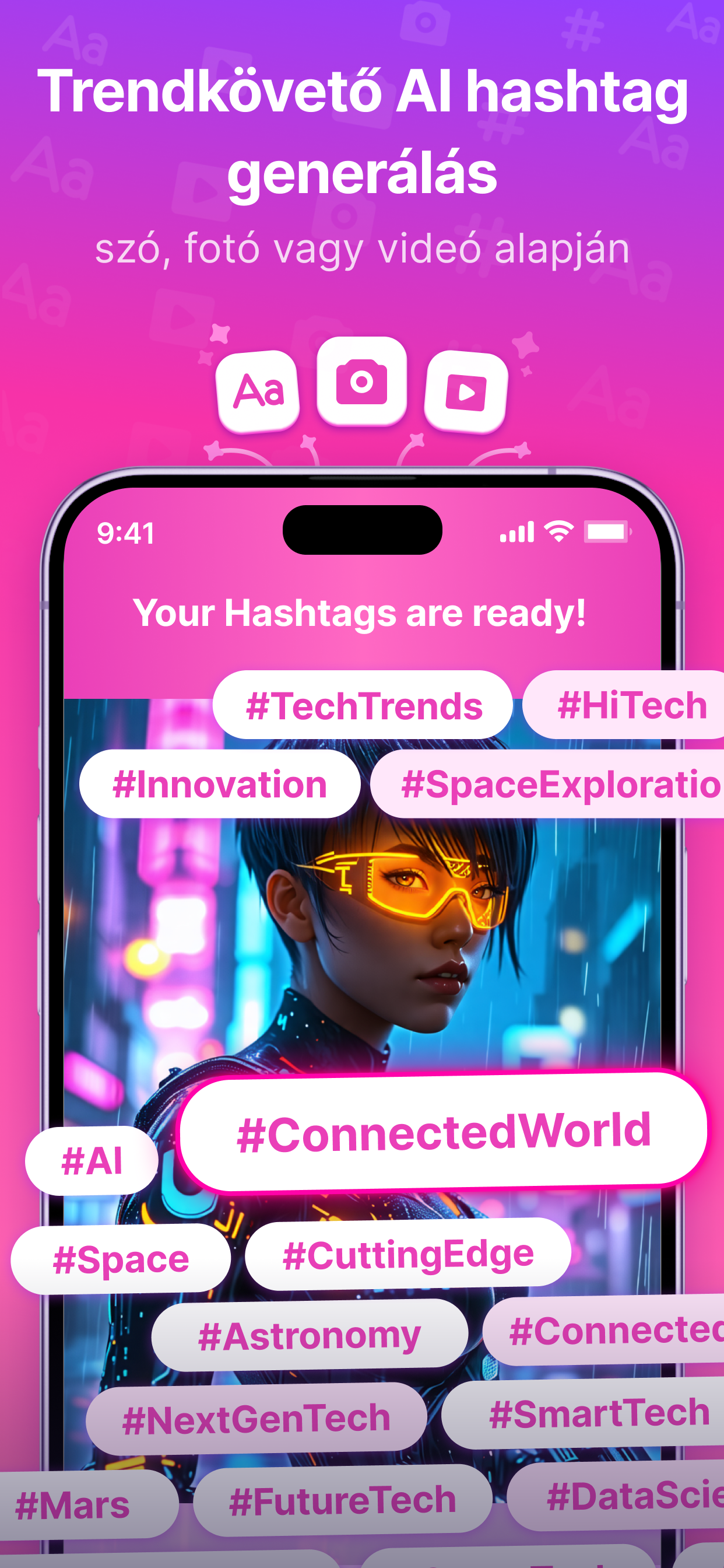 Egyéni AI hashtagek: Automatikusan fedezd fel a trendi hashtageket, hogy maximalizáld tartalmad láthatóságát bármelyik közösségi hálózaton.