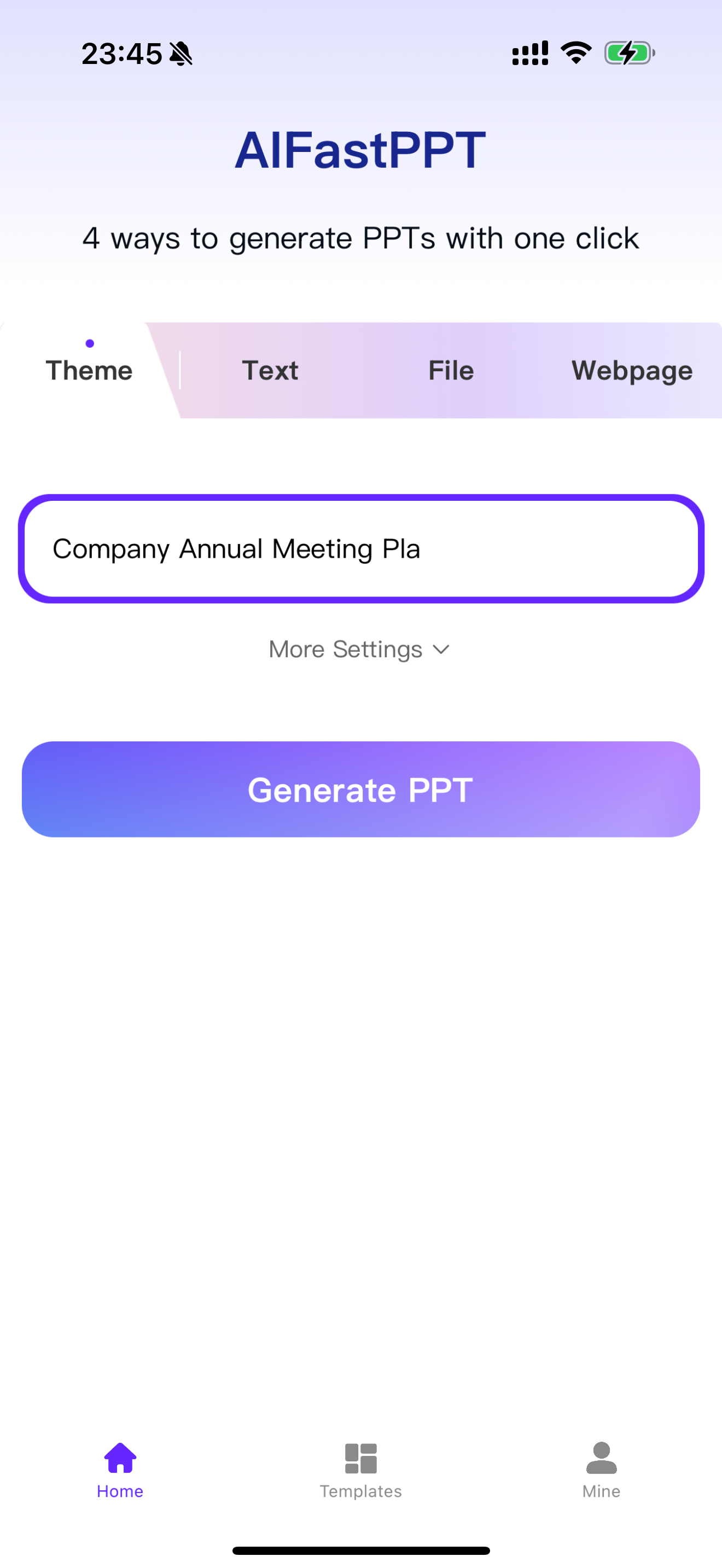- File Upload Generation: Supports document uploads to automatically extract key content and generate a PPT.