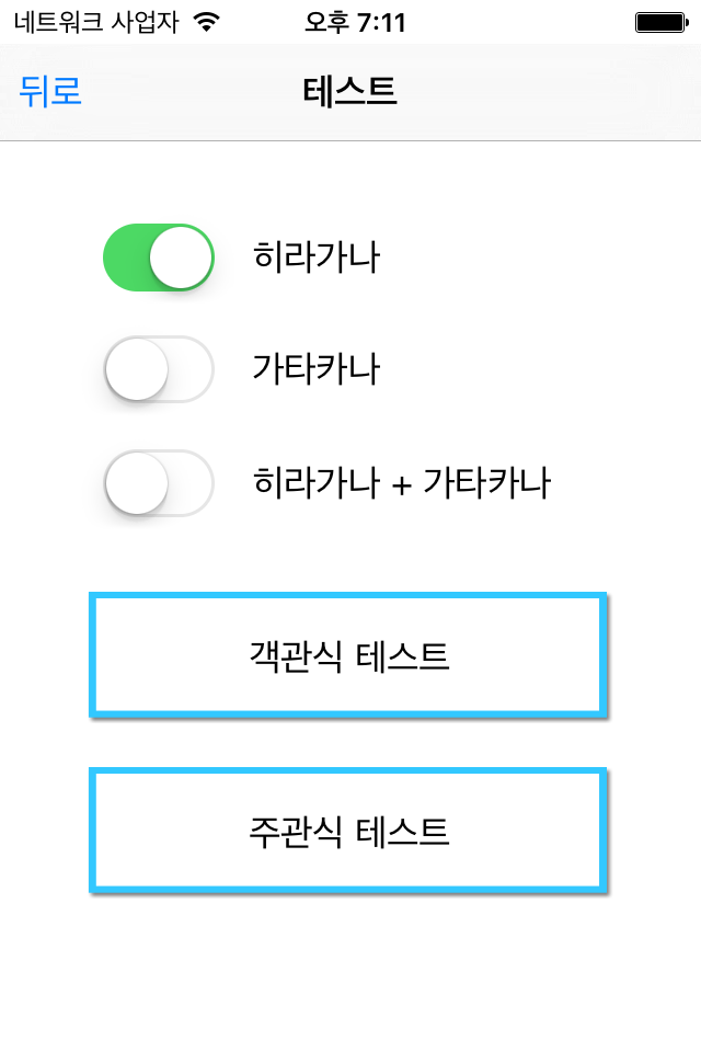 - 히라가나만 또는 가타카나만 체크할 수 있고 둘을 합쳐서 테스트 할 수도 있습니다.