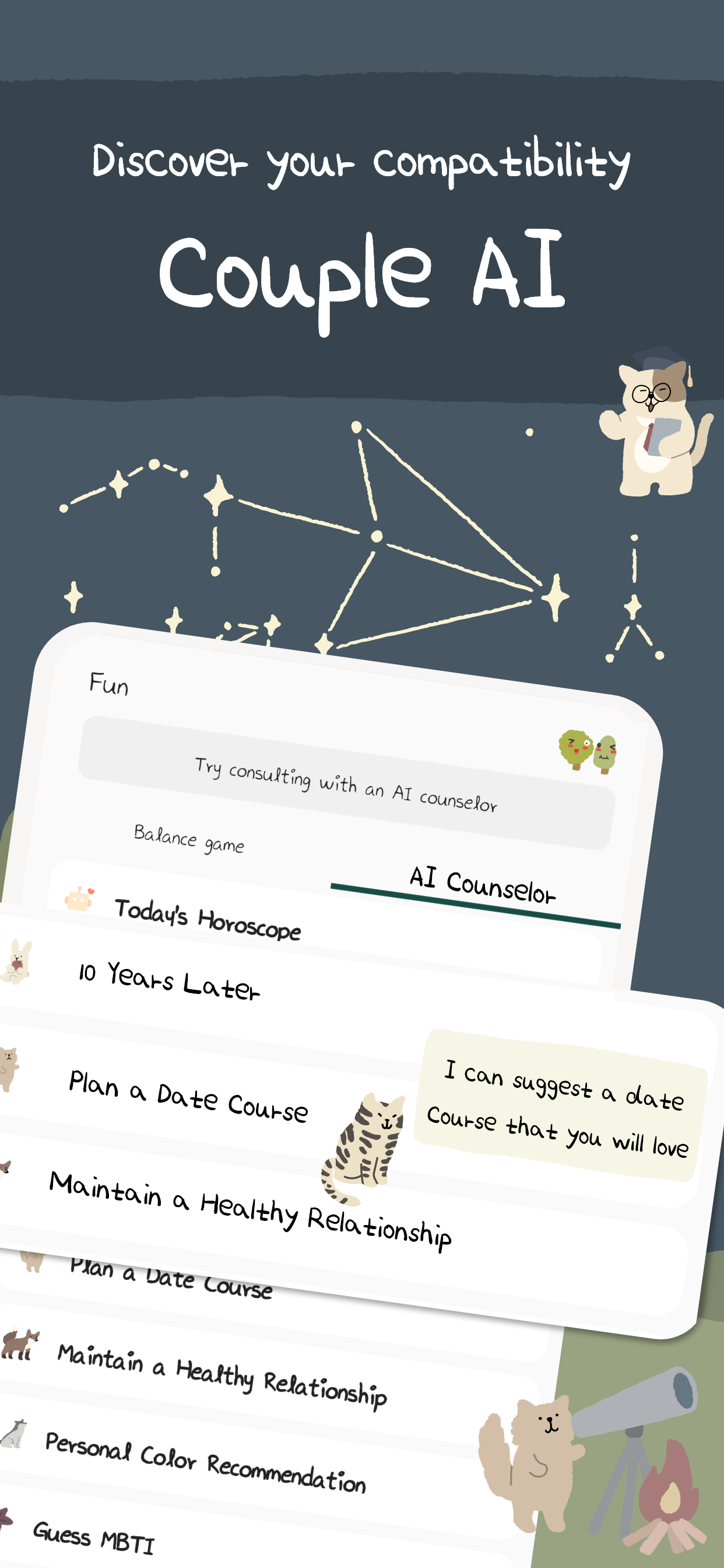 -With our Cat AI Counselor, find out personalized date courses just for the two of us and even see what we’ll be like in 10 years!