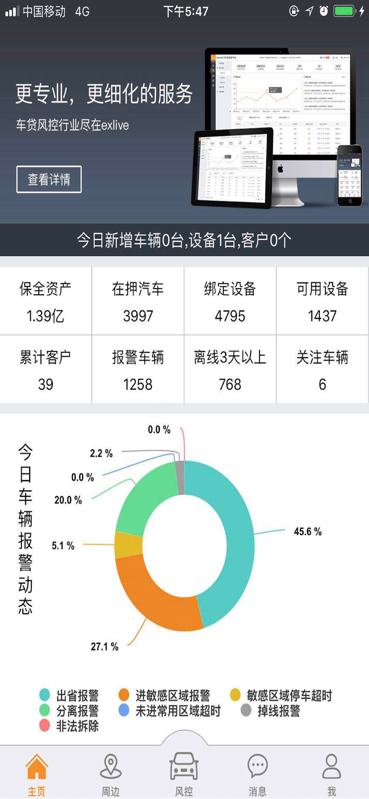 事前风险控制,事中风险控制,事后风险处置为主线解决车贷风控行业痛点问题;事前风险控制,通过信用评估模块实现多个维度查询车主信用,降低贷前风险;事中风险控制,实时监控、报警推送、资产分析、统计报表、风险预警、风险评估等功能达到平台自动判断风险车辆、实时报警推送、平台通过算法数据整理;事后风险处置,轨迹风险评估记录风险轨迹,追车事件记录。