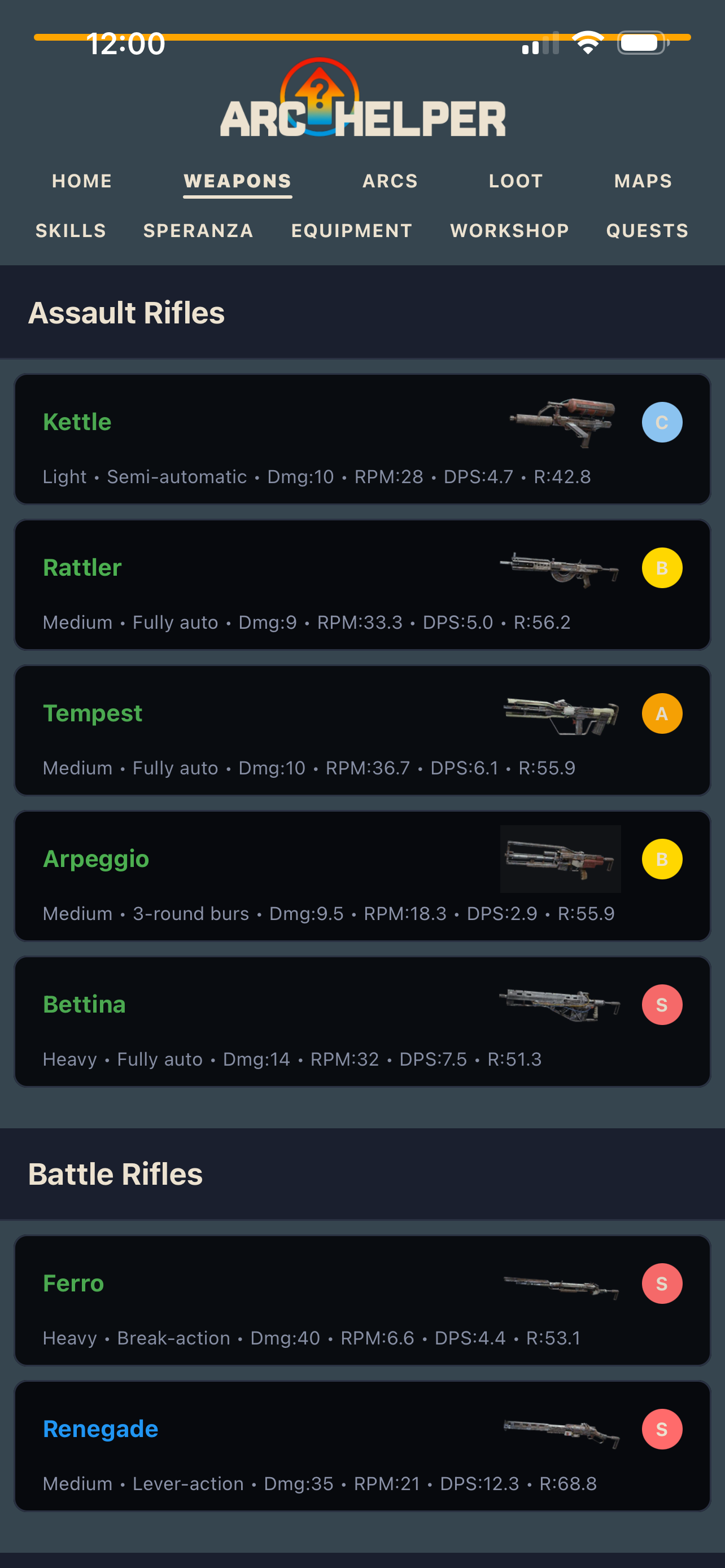 • Tier rankings (S, A, B, C) for every weapon